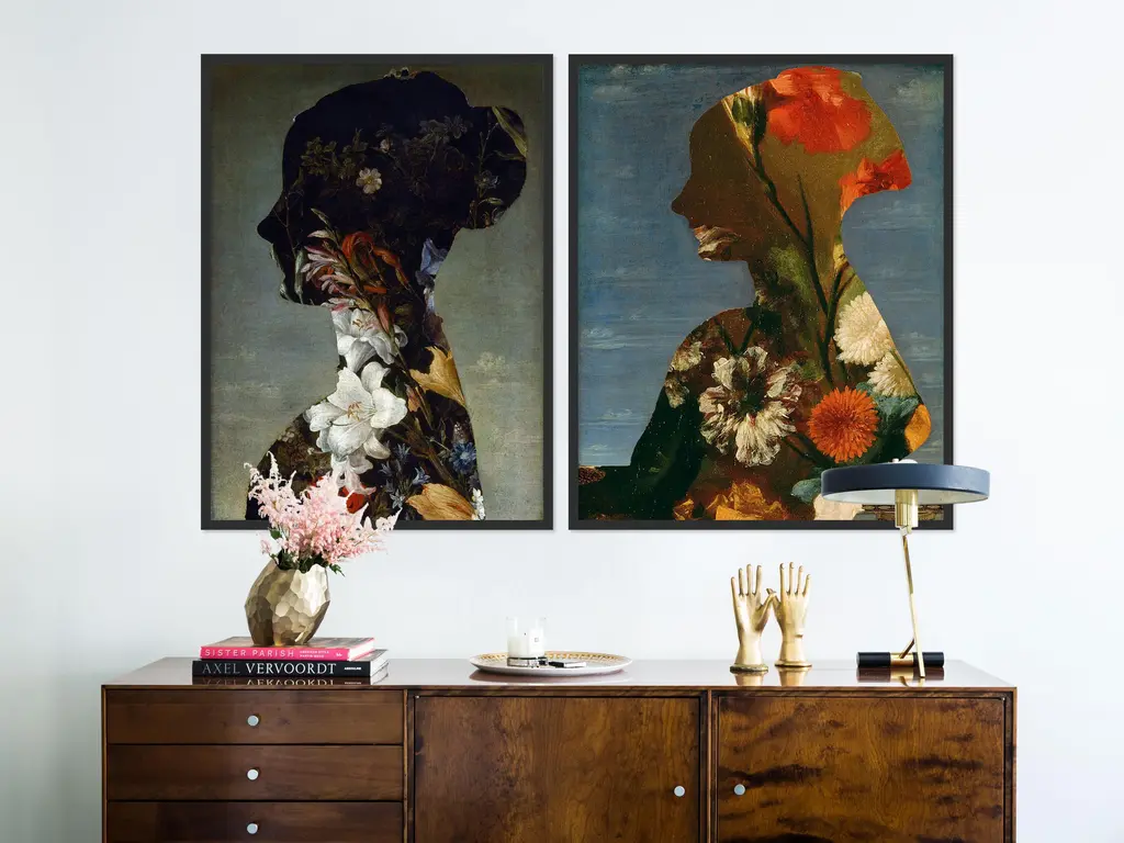 DESCRIPTION: Floral Silhouette Diptych by Lara Fowler in Black Frame, Medium Art Print SPECIFICATIONS: Type: Framed Paper. Individual Frame Size (in): 26.5x36. Orientation: Vertical. Flush/Float/Matted: Flush. Frame Color: Black. Hanging Hardware: Picture Perfect. 2 pieces are included with this purchase. Overall set dimensions as pictured: 53x36. FRAMING: Each art work arrives framed and ready to hang. We use handmade frames with a plexiglass glazing front, because it offers less glare than standard glass. At this time, we only offer framed prints. ARTIST BIO: Lara Fowler is a British artist who creates quirky art prints with a twist.