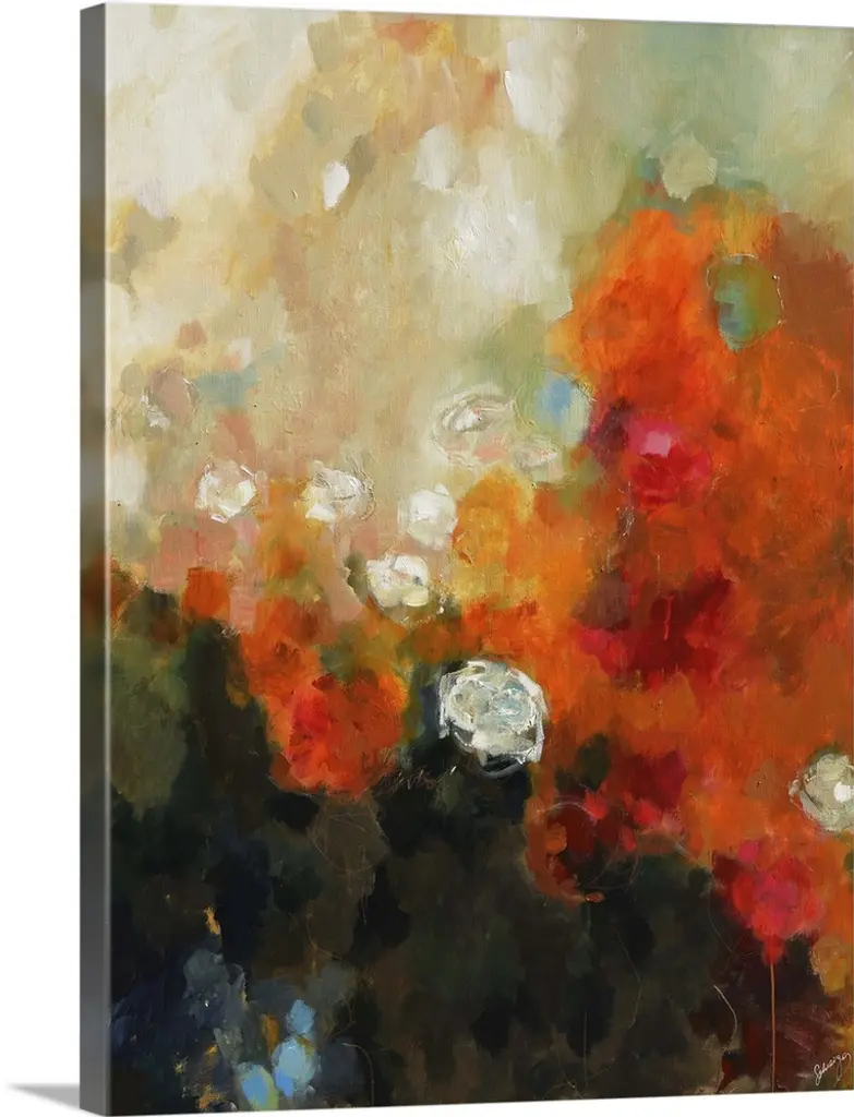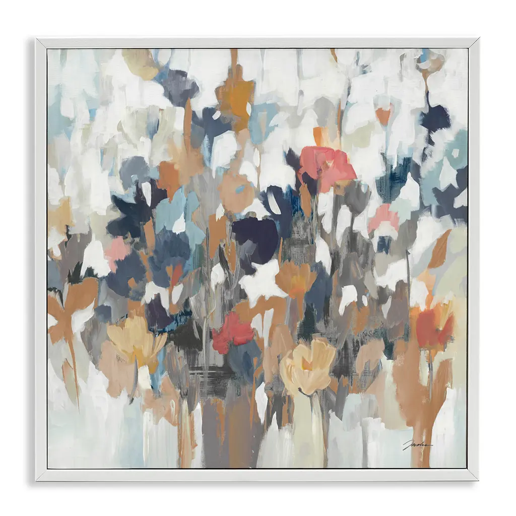Gallery-Wrapped Canvas entitled 'Floral Splash I'. Square contemporary painting of a group of colorful flowers with long stems on a neutral background. . Multiple sizes available. Primary colors within this image include: Dark Red, Brown, Light Gray, White. Made in the USA. All products come with a 365 day workmanship guarantee. Inks used are latex-based and designed to last. Canvases have a UVB protection built in to protect against fading and moisture and are designed to last for over 100 years. Canvas is a 65% polyester, 35% cotton base, with two acrylic latex primer basecoats and a semi-gloss inkjet receptive topcoat.