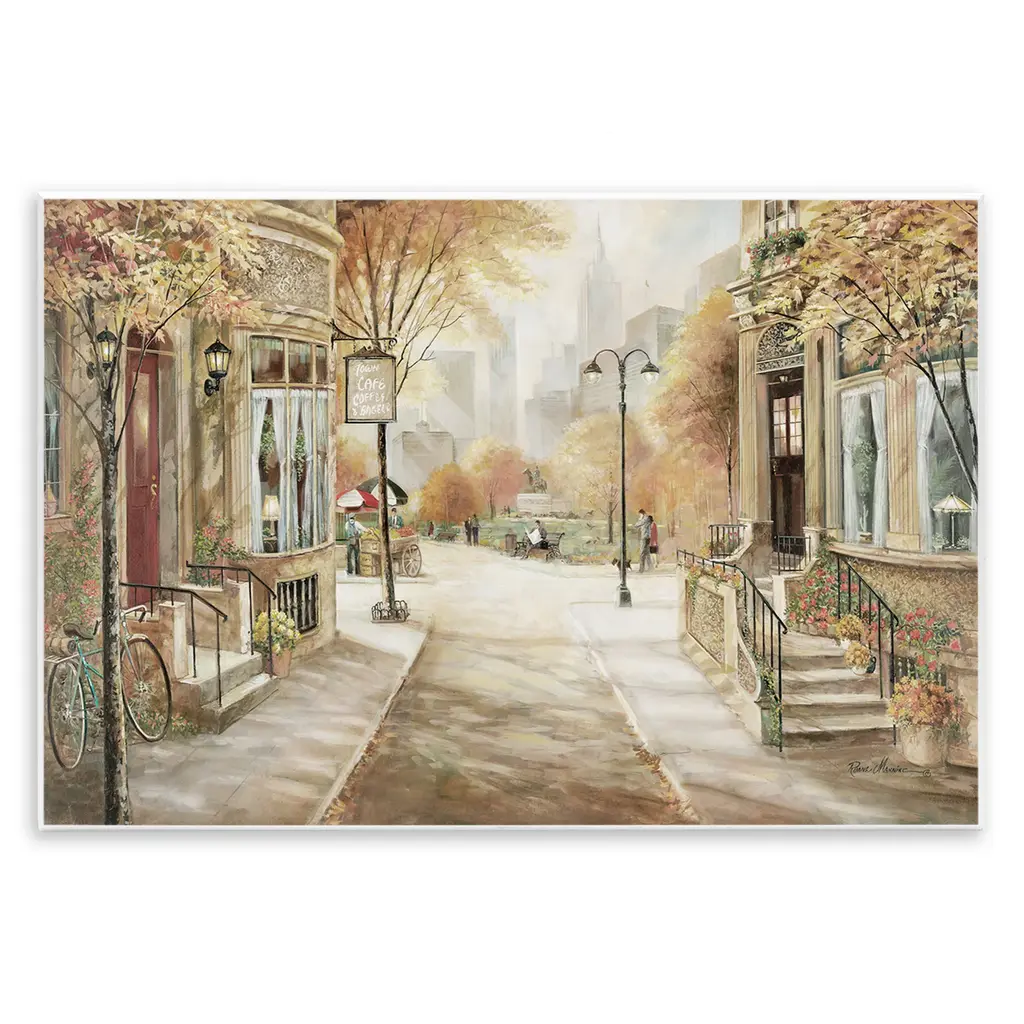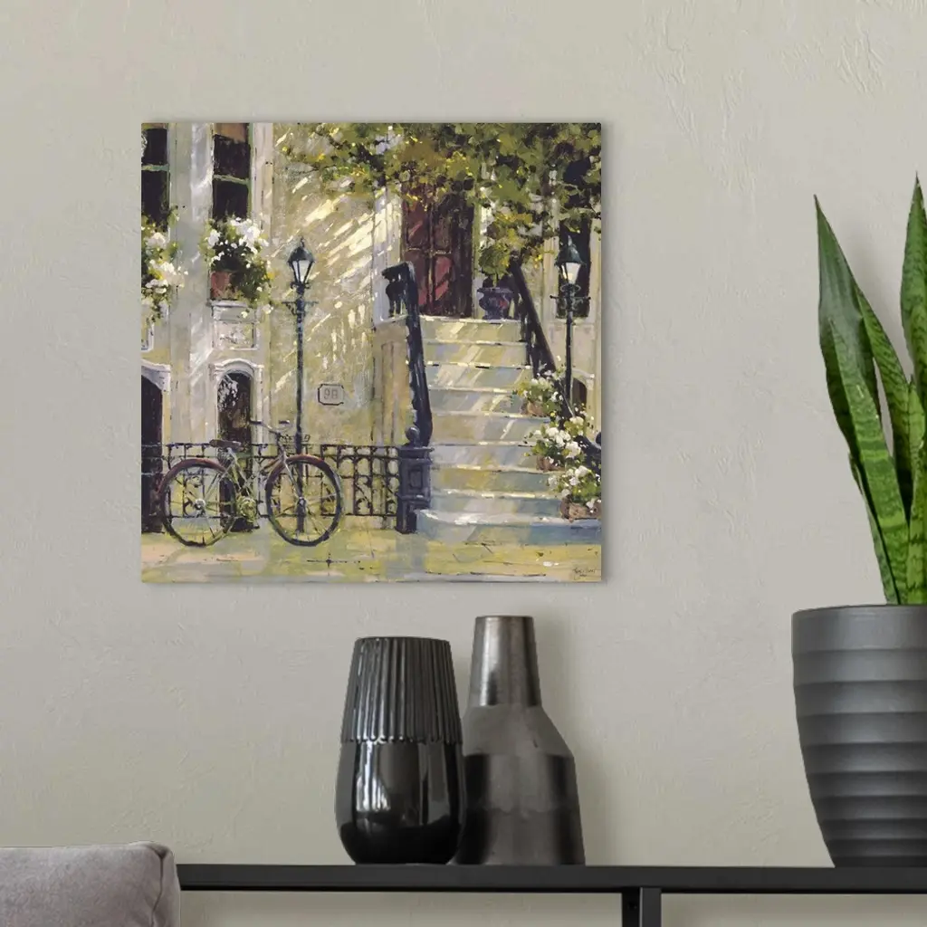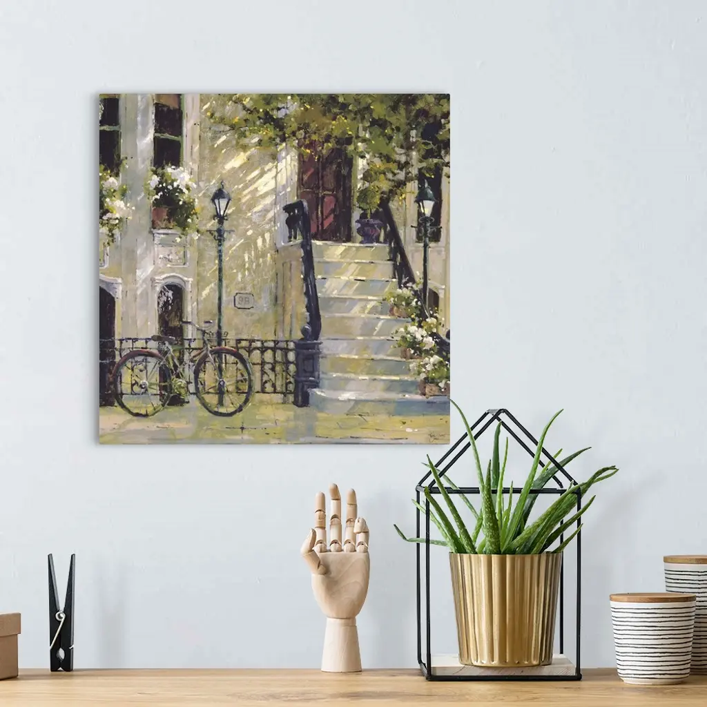 Contemporary painting of a bicycle leaning against a city street light post, outside a building.