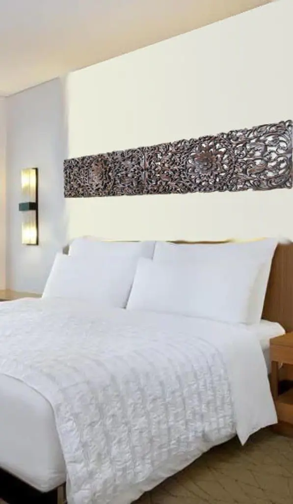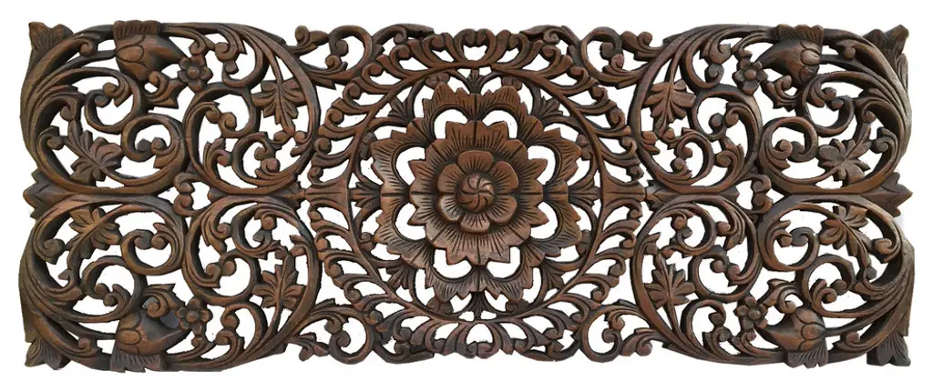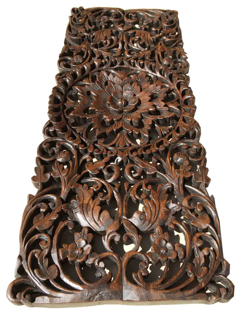 Large Wood Carved Panels. Perfect for large wall decoration. Floral wall art that will add beauty to any room. This carved wood plaque can be used as headboard that will add beauty to your bedroom. Made from teak wood. A product of Thailand that expresses a wonderful home decorative ambiance.Size • Weight • Color • MaterialsHeight: 35.5" InchesWidth: 13.5" InchesThickness: 1" InchesWeight: 8.0 lbs.Material: Teak WoodPlease note that you may see a slight difference in color as compared to that seen on your computer screen. Also, since most products are handmade and they are crafted from natural wood, there may be a slight size variation.