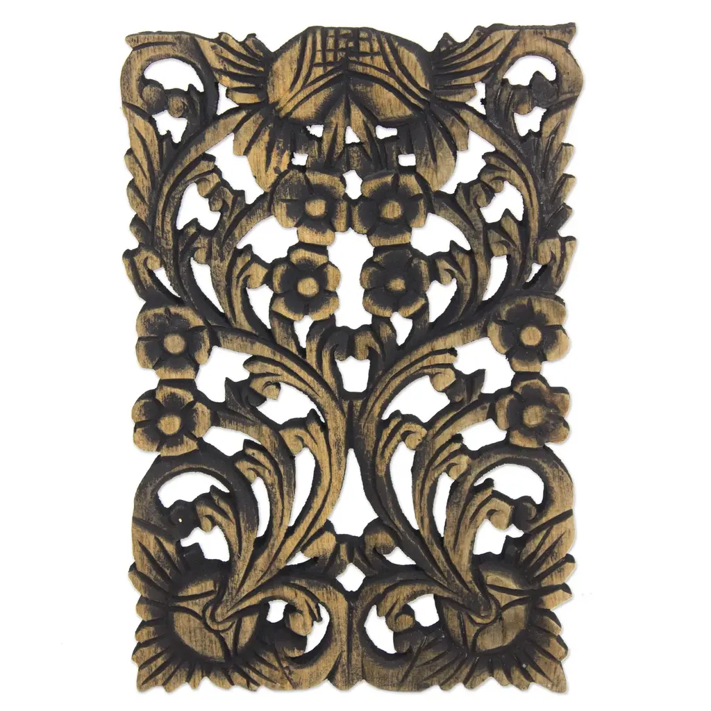 Floral Tropical Carved Wood Wall Panel, Dark Brown
