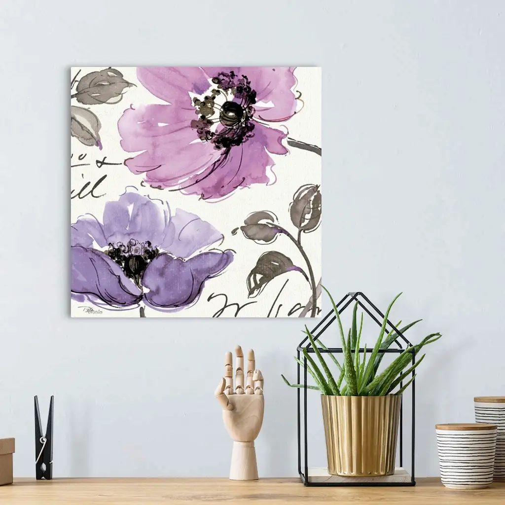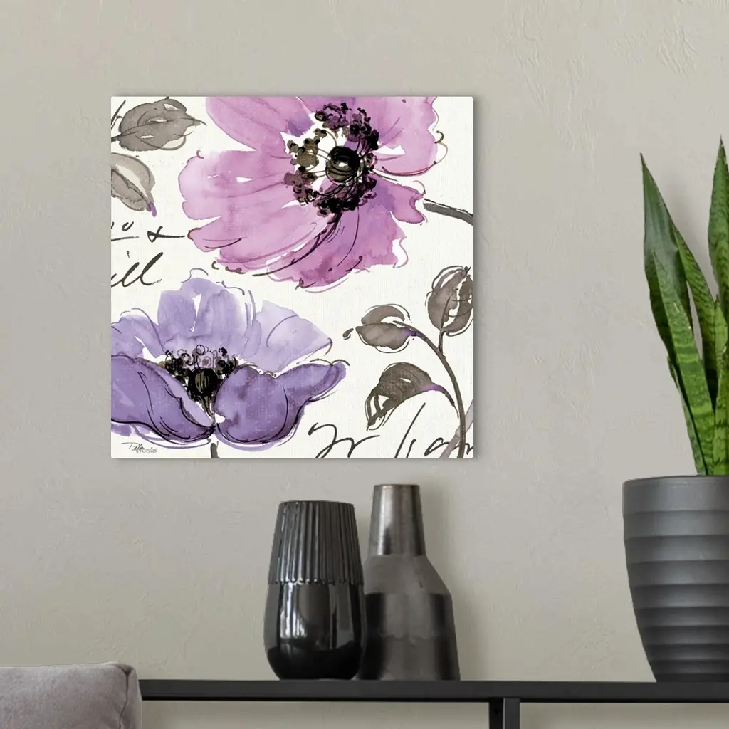 Contemporary watercolor painting of purple flowers on a neutral toned background with text.