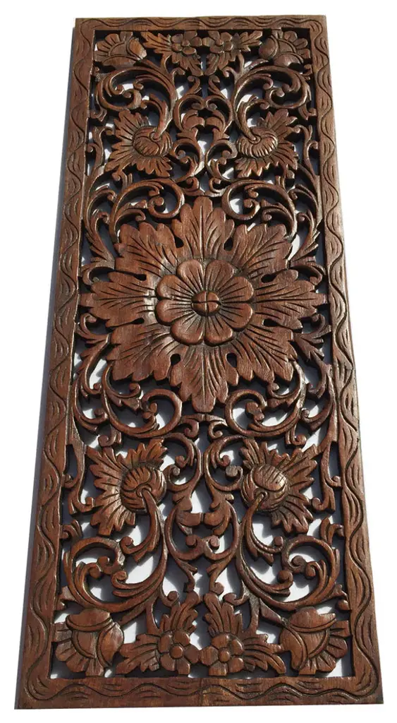 Large Wood Carved Panels. Perfect for large wall decoration. Floral wall art that will add beauty to any room. This carved wood plaque can be used as cabinet doors and vanities that will add beauty to your home. Made from teak wood. A product of Thailand that expresses a wonderful home decorative ambiance.SIZE - WEIGHT - COLOR - MATERIAL Height: 35.5" InchesWidth: 13.5" InchesThickness: 0.5" InchesWeight: 6.0 lbs.Material: Teak Wood