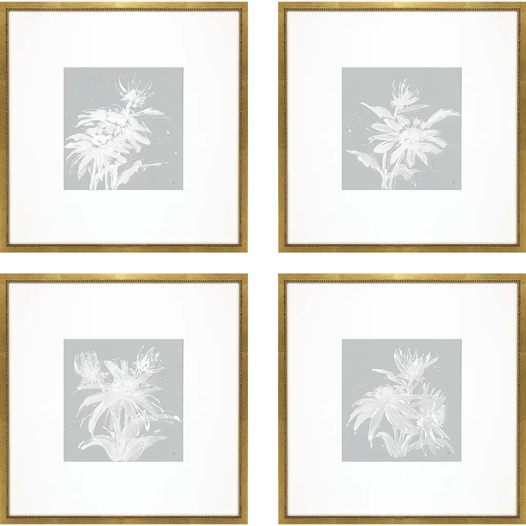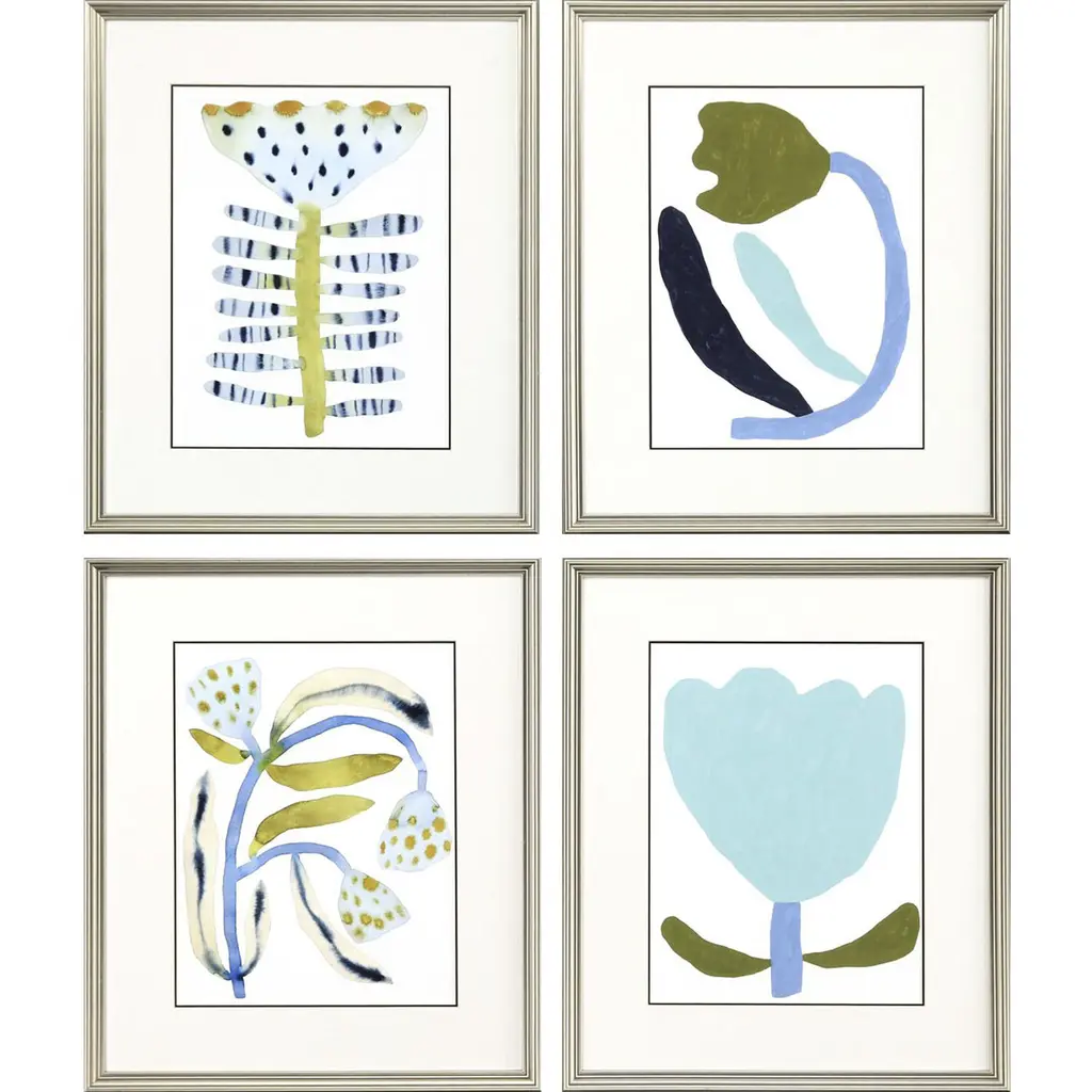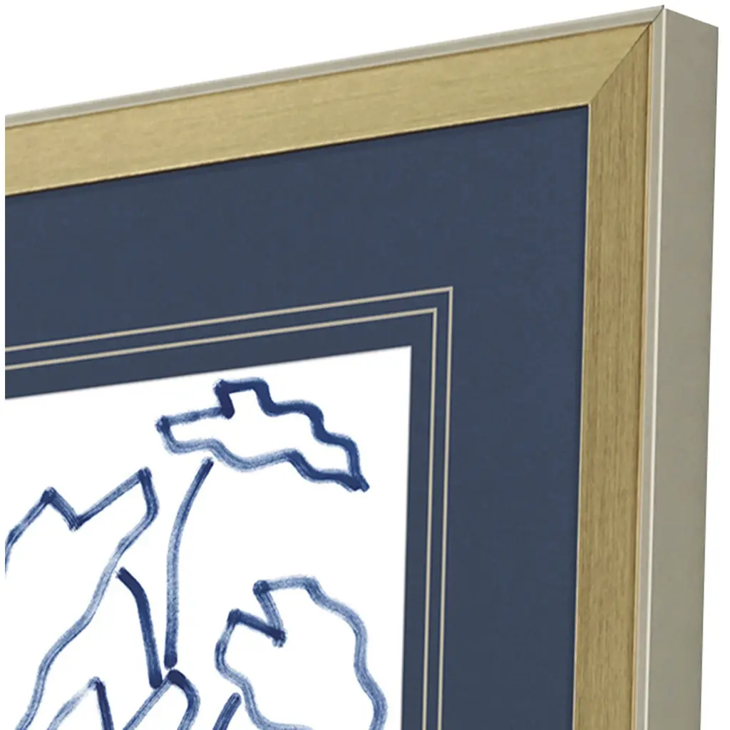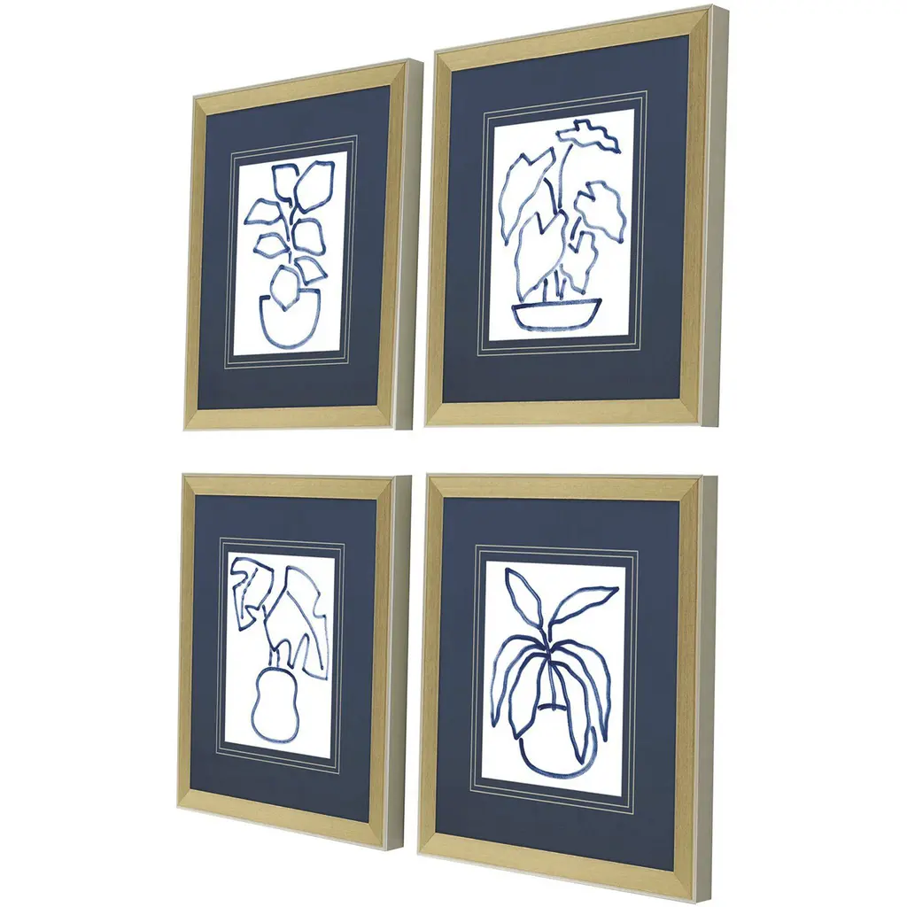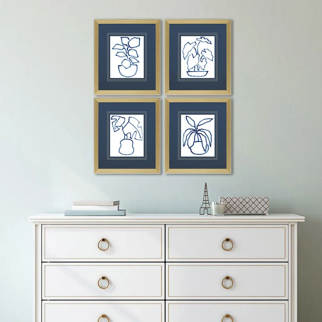 A set of four blue plant sketch image accentuated with a mat and double v-groove. These pieces are framed under glass and paired with a gold frame.
