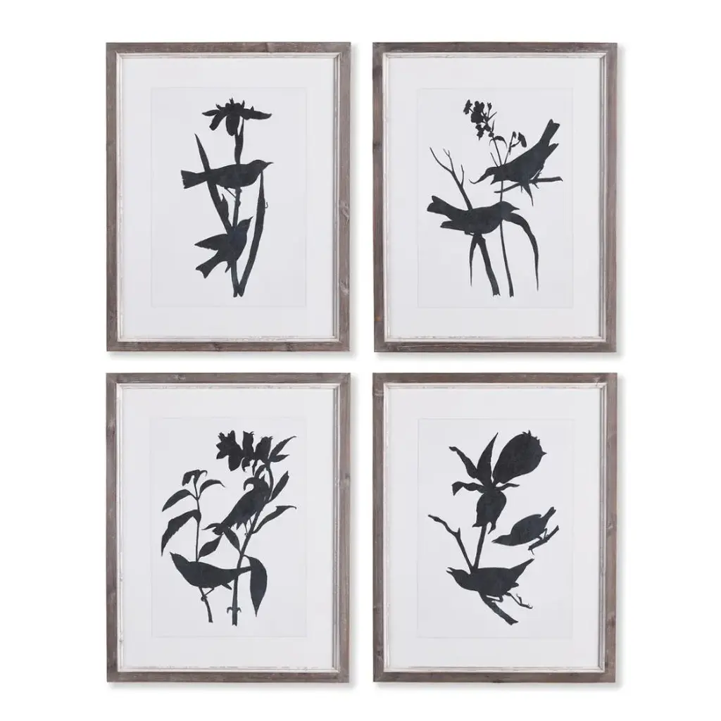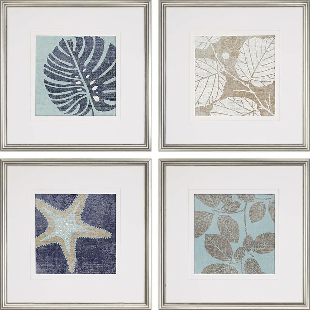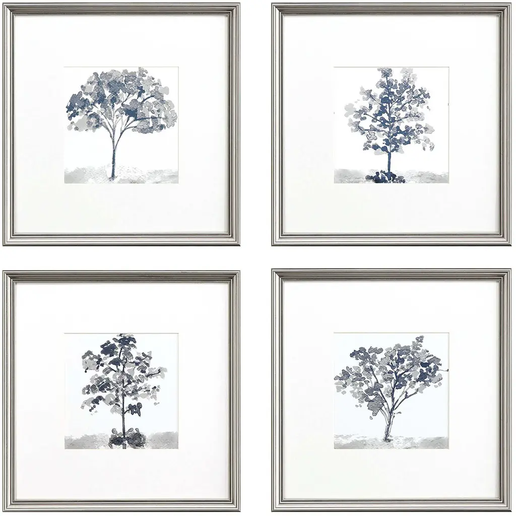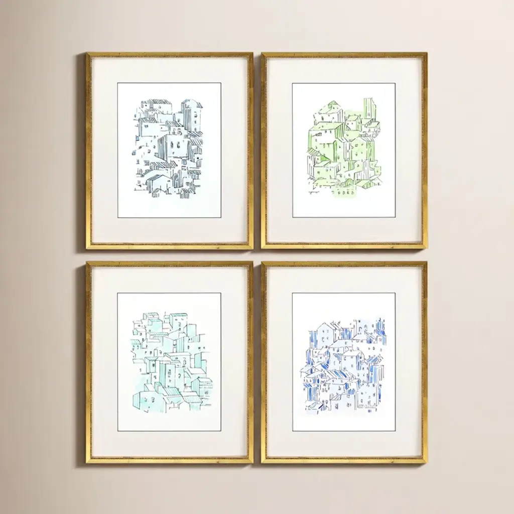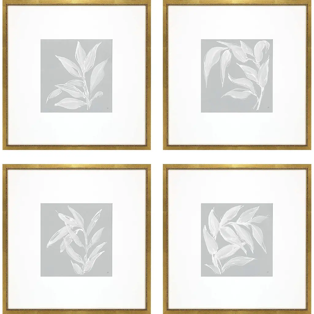 A set of four blue plant sketch image accentuated with a mat and double v-groove. These pieces are framed under glass and paired with a gold frame.