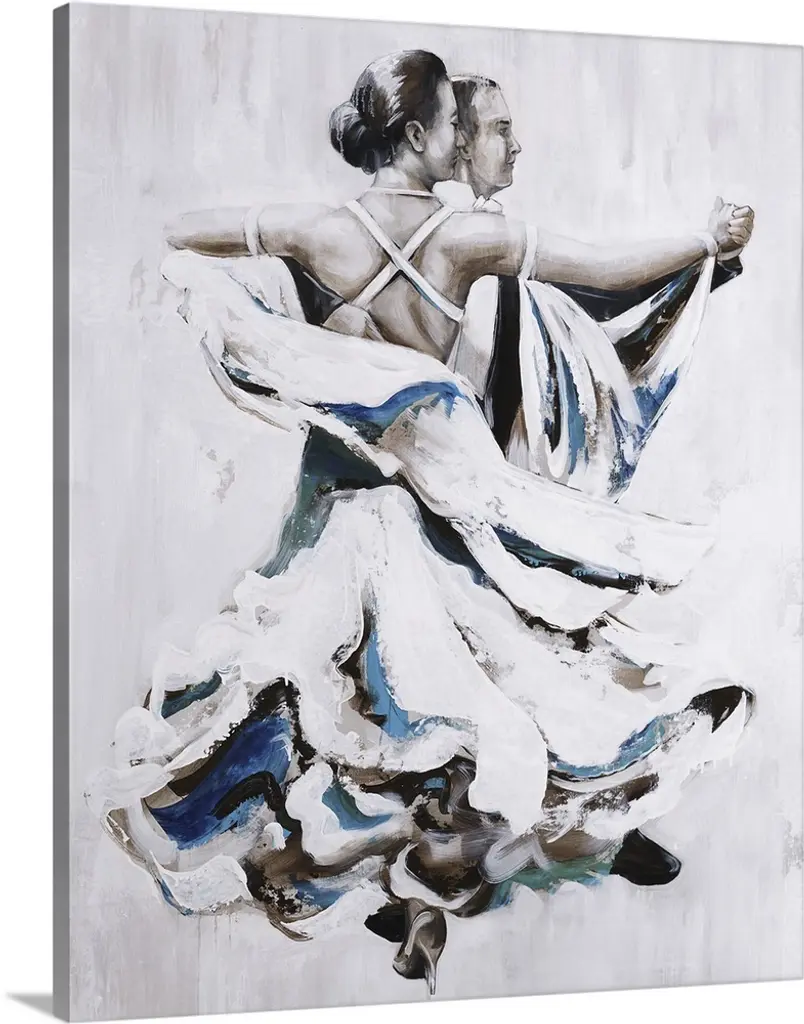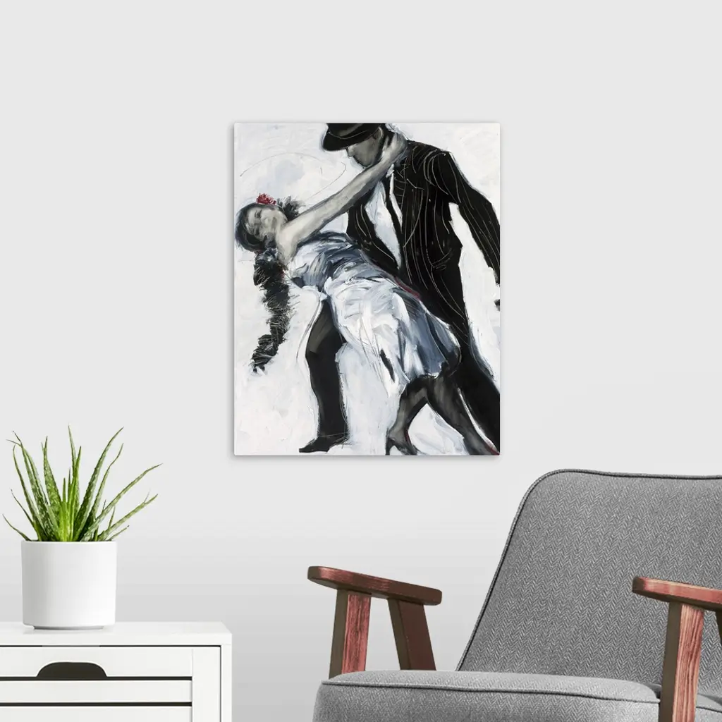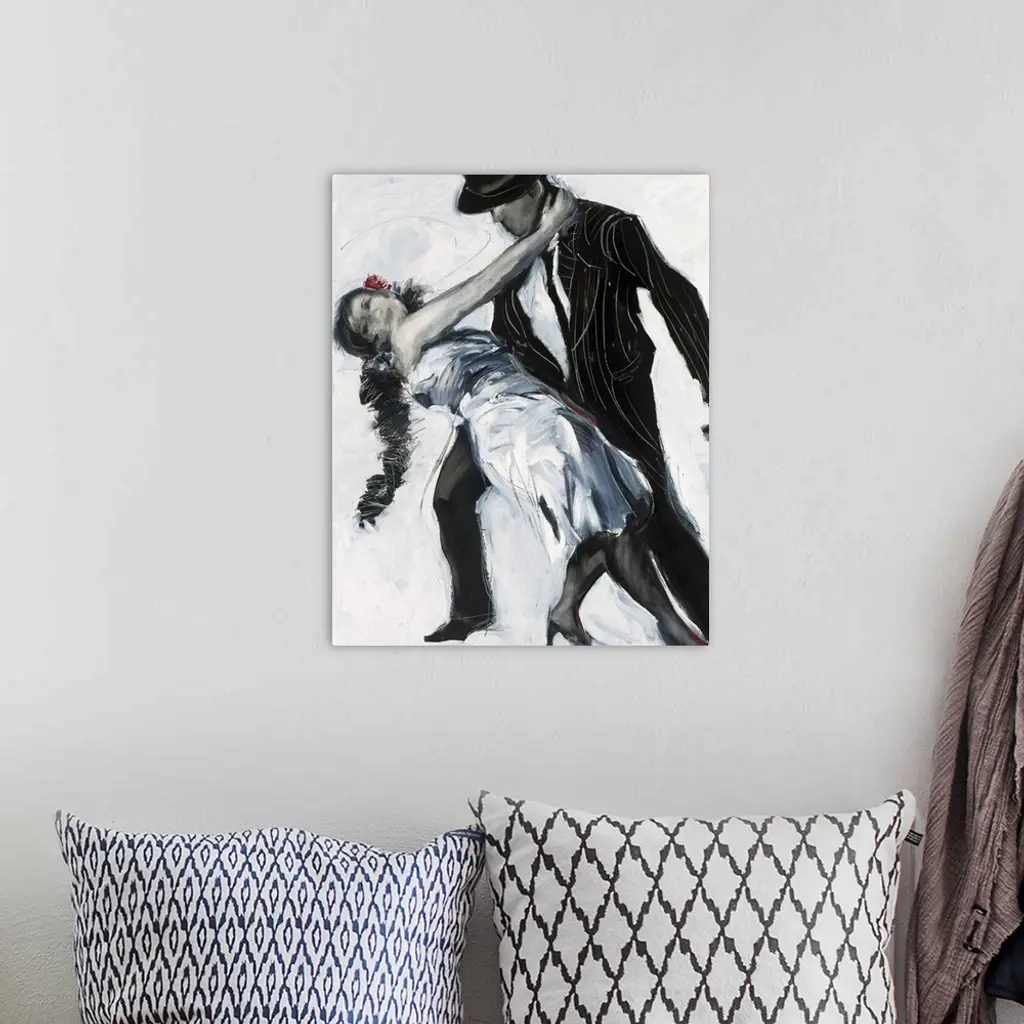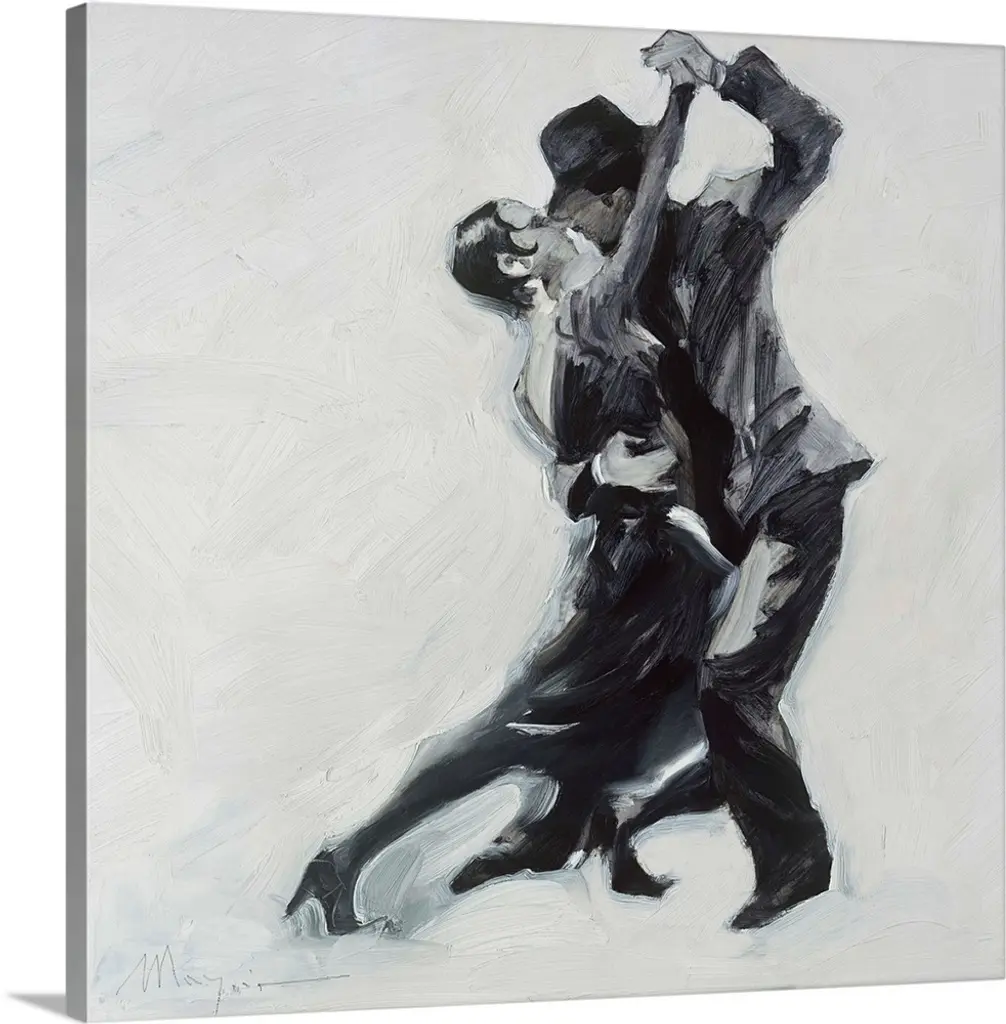 Artwork of two people dancing. The woman has her hand wrapped around the man's neck as he dips her down to his leg.