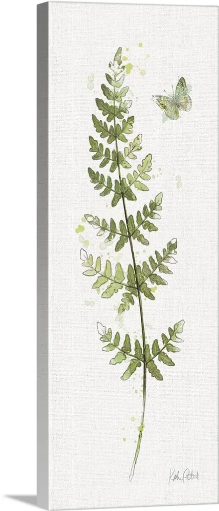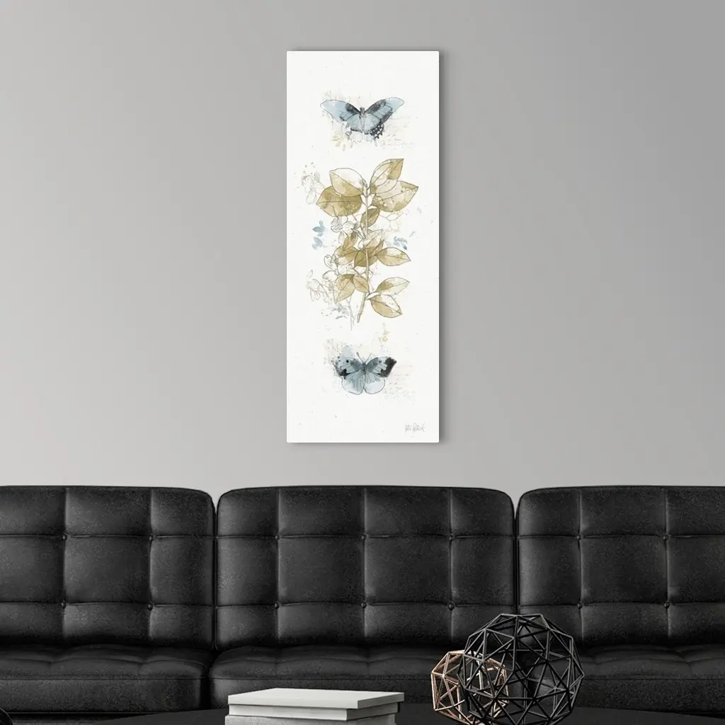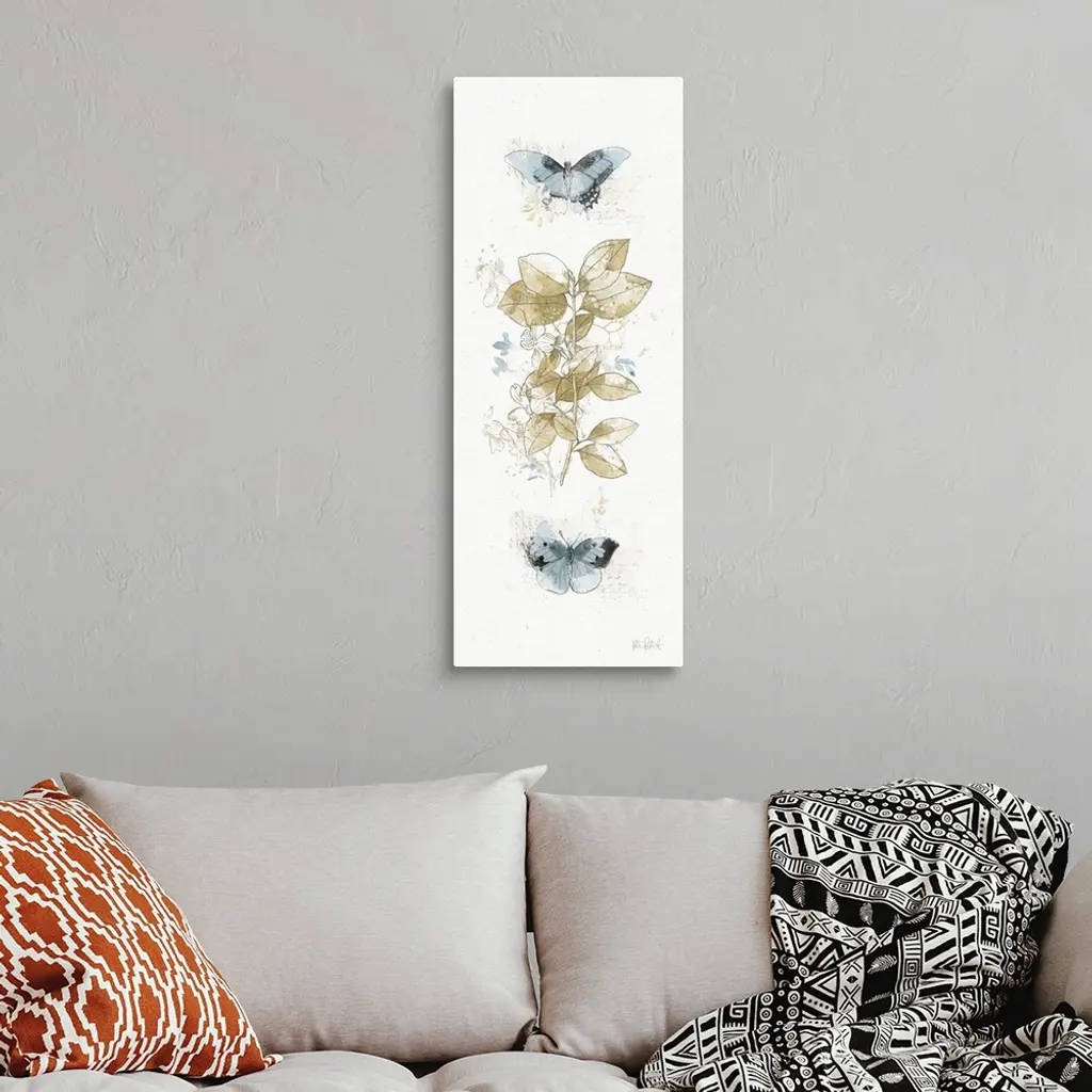 Tall rectangular watercolor painting collage with beige leaves and blue butterflies on a neutral colored background with faint handwritten text.