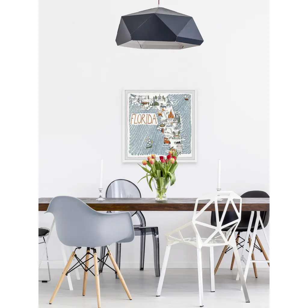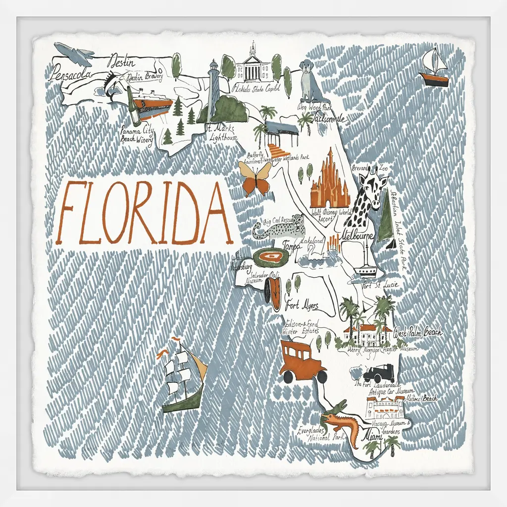 Show off all that Florida has to offer with this textual map of the state that includes meaningful symbols to represent each hot spot. Proudly printed in the USA, this piece is printed on high quality archive paper and professionally hand-framed. With wall-mounting hooks included, this artful accent is ready to hang up as soon as it reaches your front door. • Top quality Giclee print on high resolution Archive Paper • Hand cut deckled edges • High quality durable non-warping frame • Finished under shatter resistant plexiglass • Arrives ready to hang • Includes a certificate of authenticity • Printed the USA