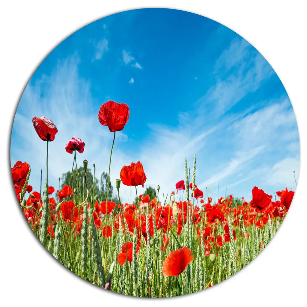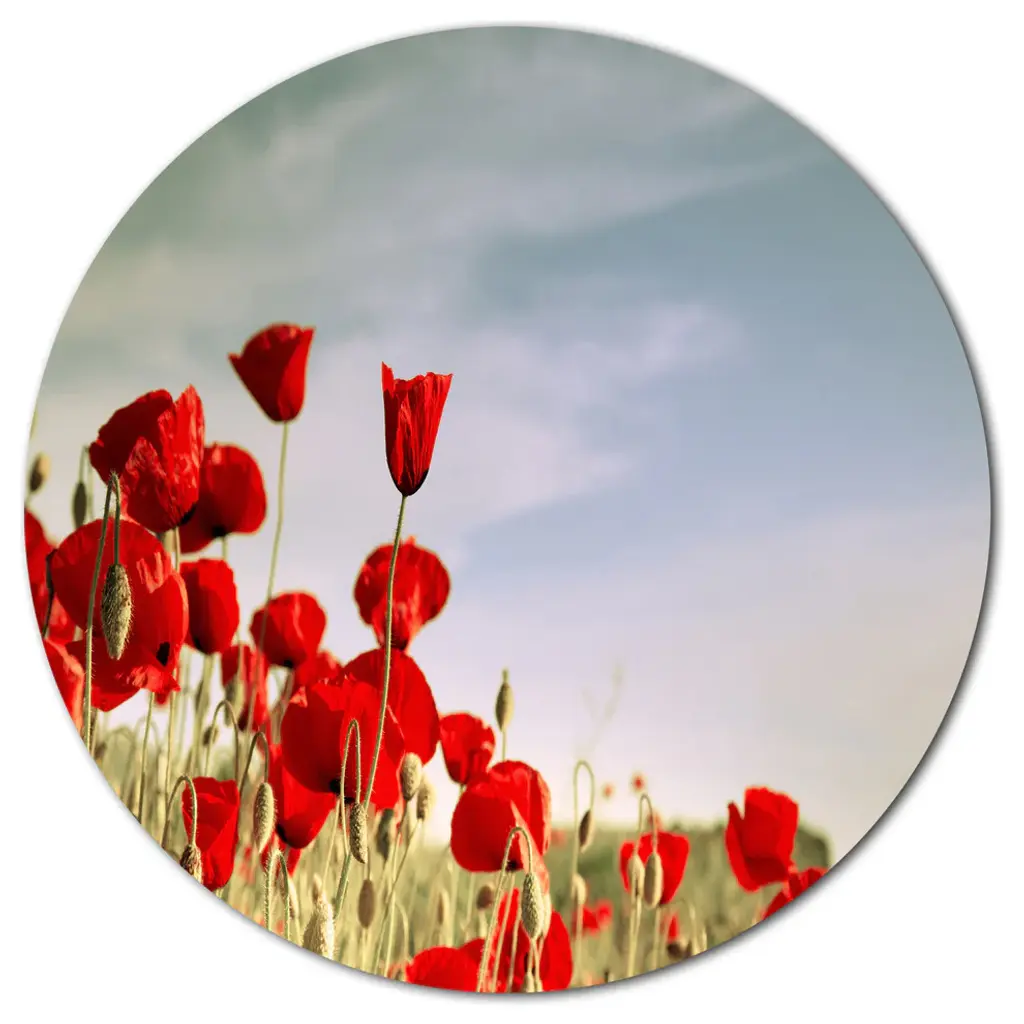 Bring Contemporary Abstraction to your home with this large Circle Metal wall art. This Flourishing Red Poppies Metal Artwork makes it the focal point of any room or office. - White Gloss Coating ensures colors are extra vibrant with light reflection.- Aluminum grade Sheet Metal with 1 inch mounting frame on the back giving the illusion that the artwork is floating on the wall..- Mounting Brackets are included along with instructions.- High Quality Digital images are created directly into a glossy aluminum panel producing a stunning and captivating print into the glossy finish of the metal.- Water, Fire and Scratch resistant HD Aluminum panels.- Looks better than any photo paper and guaranteed to last at least 20 years- Easy to clean with a microfiber cloth. Colors are far superior to regular Canvas Art. - Easy to Hang