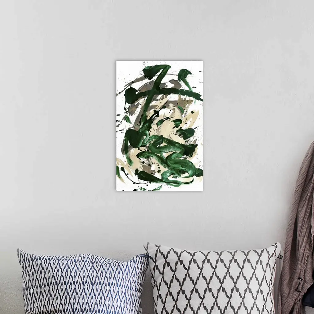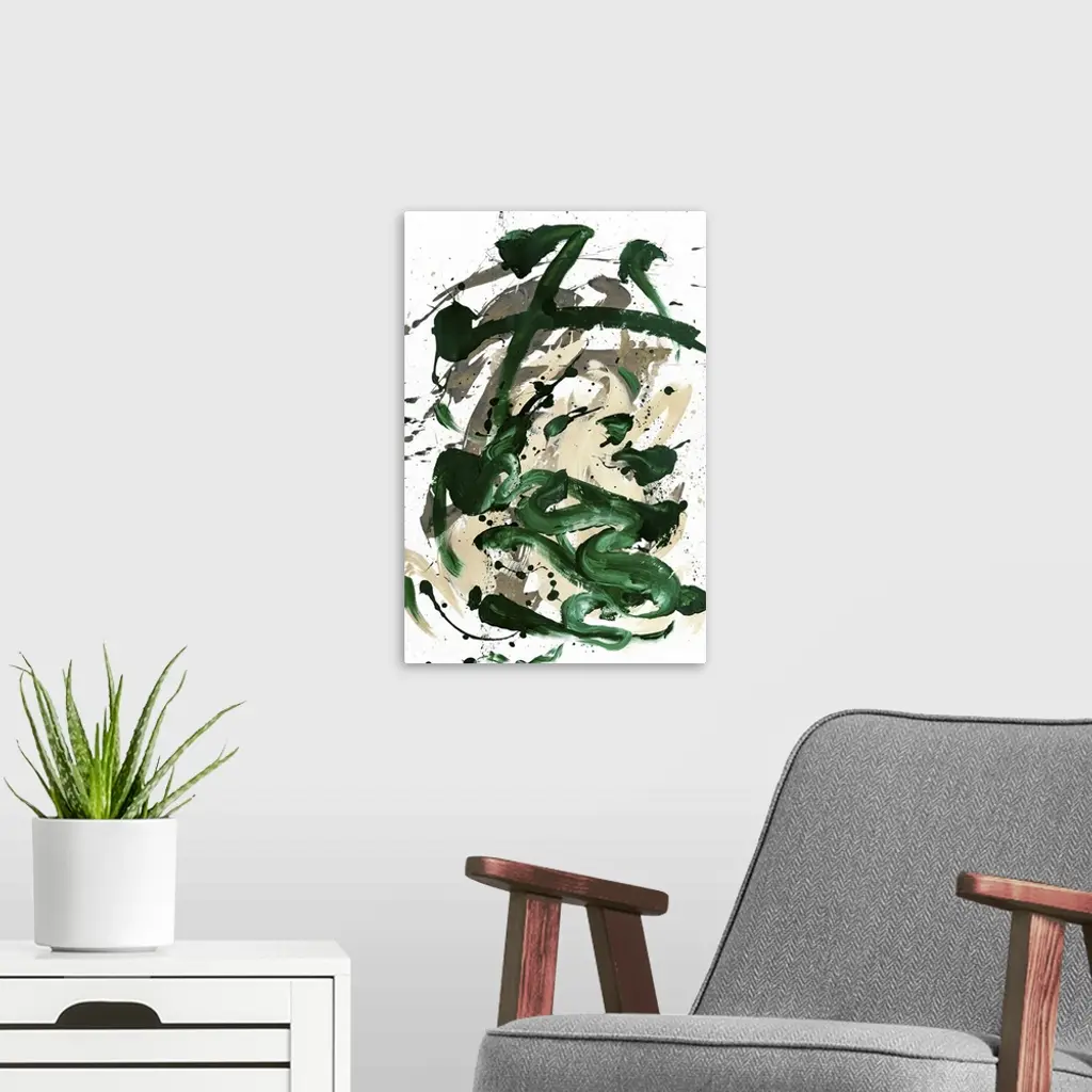 Busy abstract painting created with bold, sporadic lines in dark green and shades of beige hues on a white background.