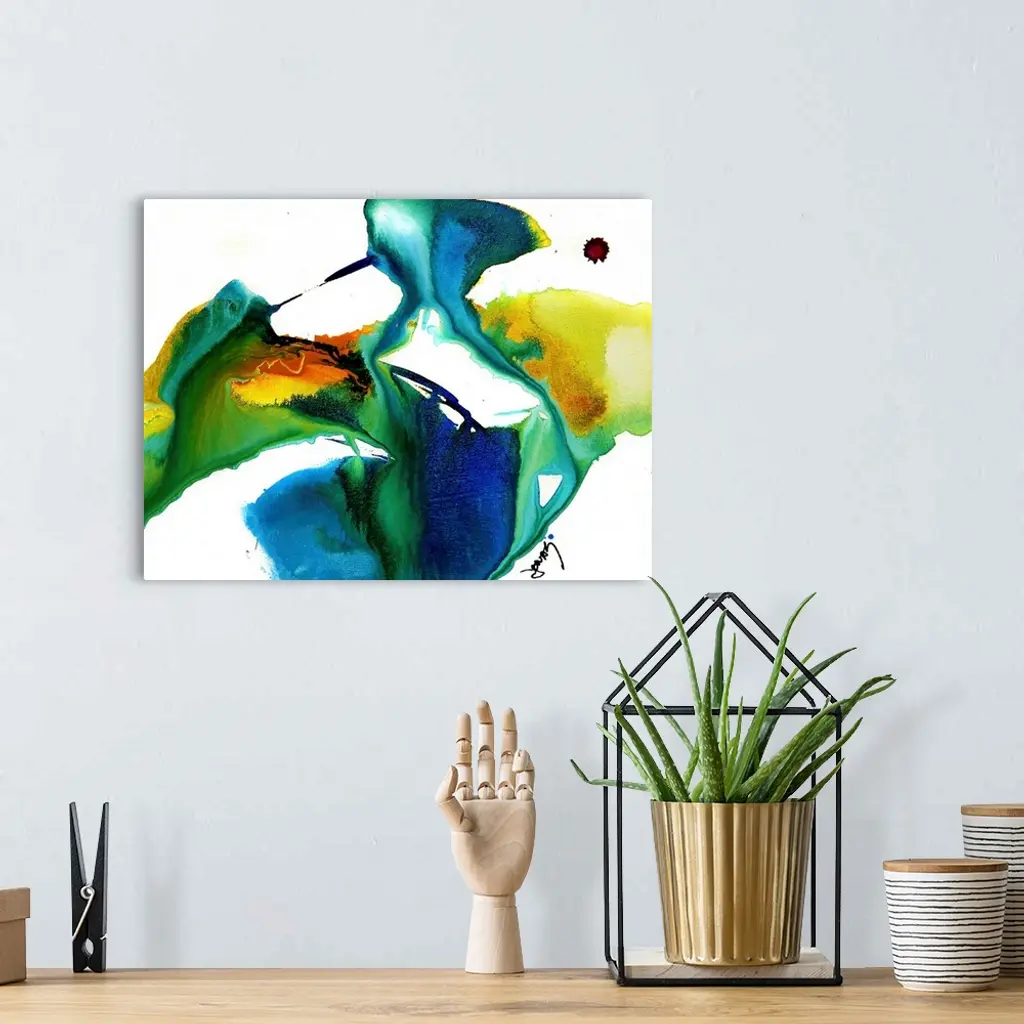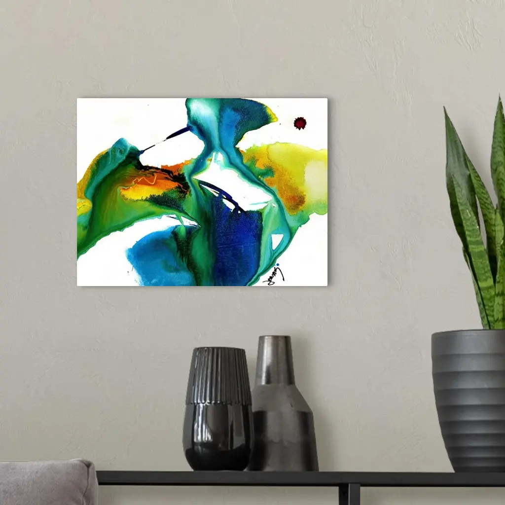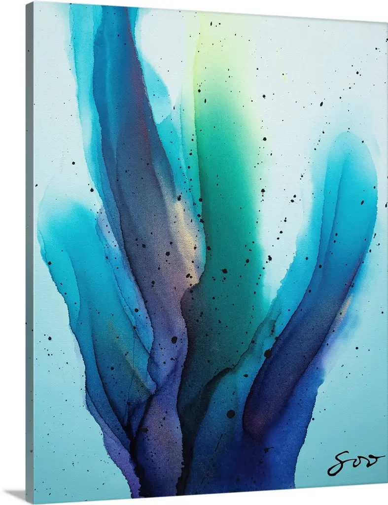A contemporary painting with abstract style the image is a splattering of cool temperature hues on a blank canvas.