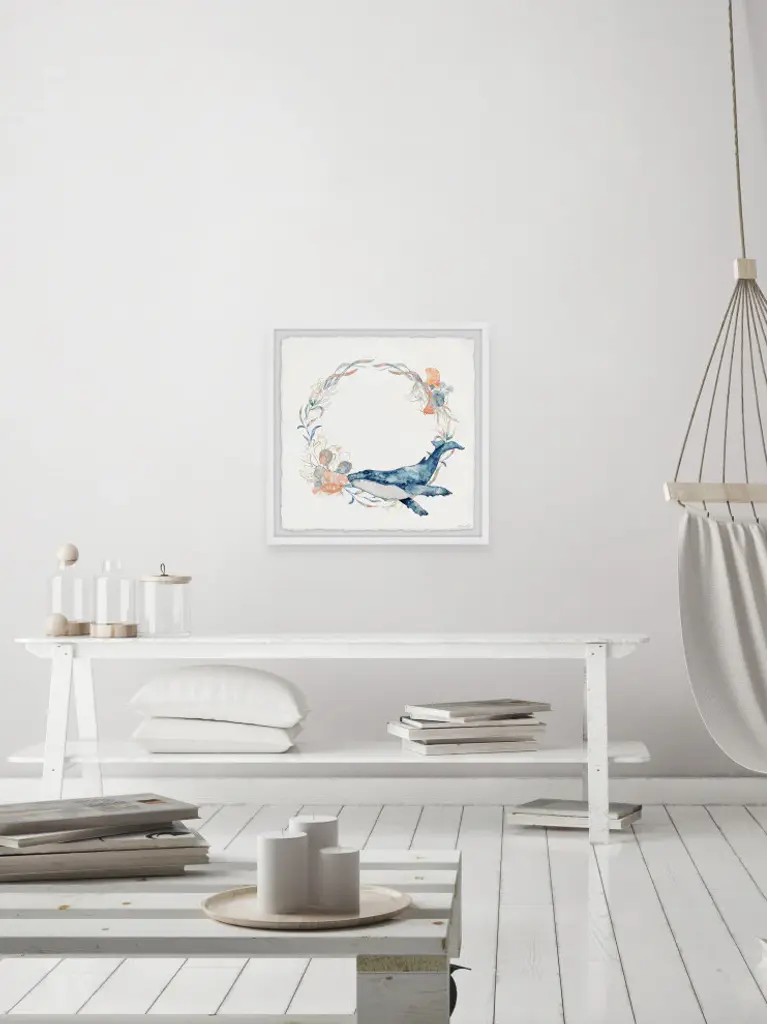 Make a statement in any coastal space with this watercolor painting print that features a large blue whale surrounded by peachy orange and blue plants. Proudly printed in the USA, this piece is printed on high quality archive paper and professionally hand-framed. With wall-mounting hooks included, this artful accent is ready to hang up as soon as it reaches your front door.- Top quality Giclee print on high resolution Archive Paper- Hand cut deckled edges- High quality durable non-warping frame- Finished under shatter resistant plexiglass- Arrives ready to hang- Includes a certificate of authenticity- Printed in the USA