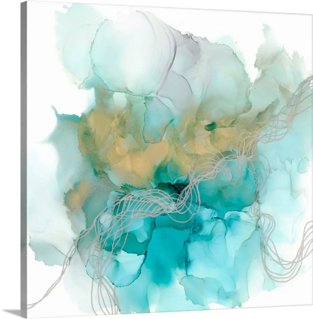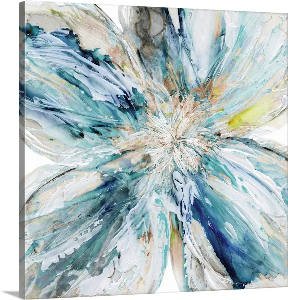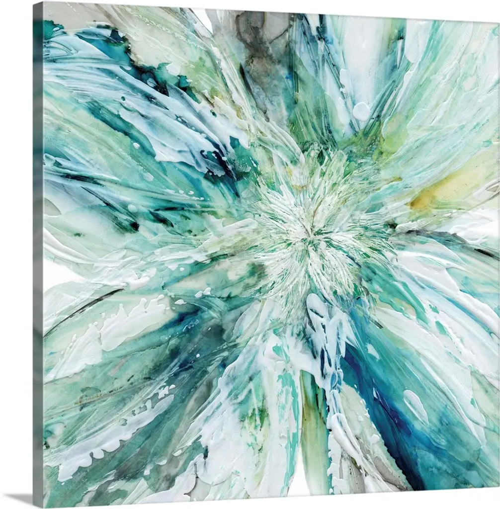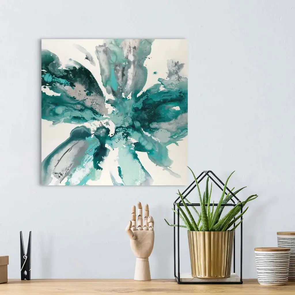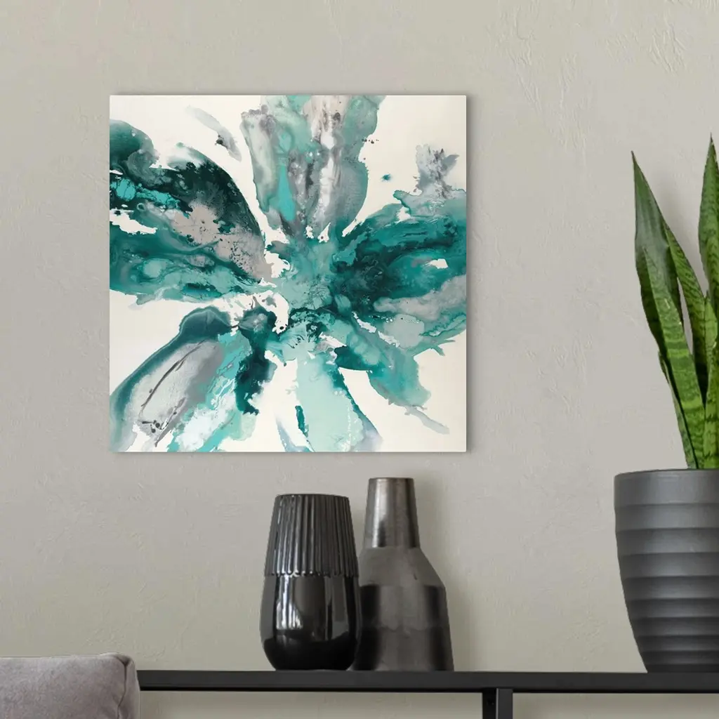 Square abstract artwork with gray and teal hues marbling together in the shape of a flower on a white background.