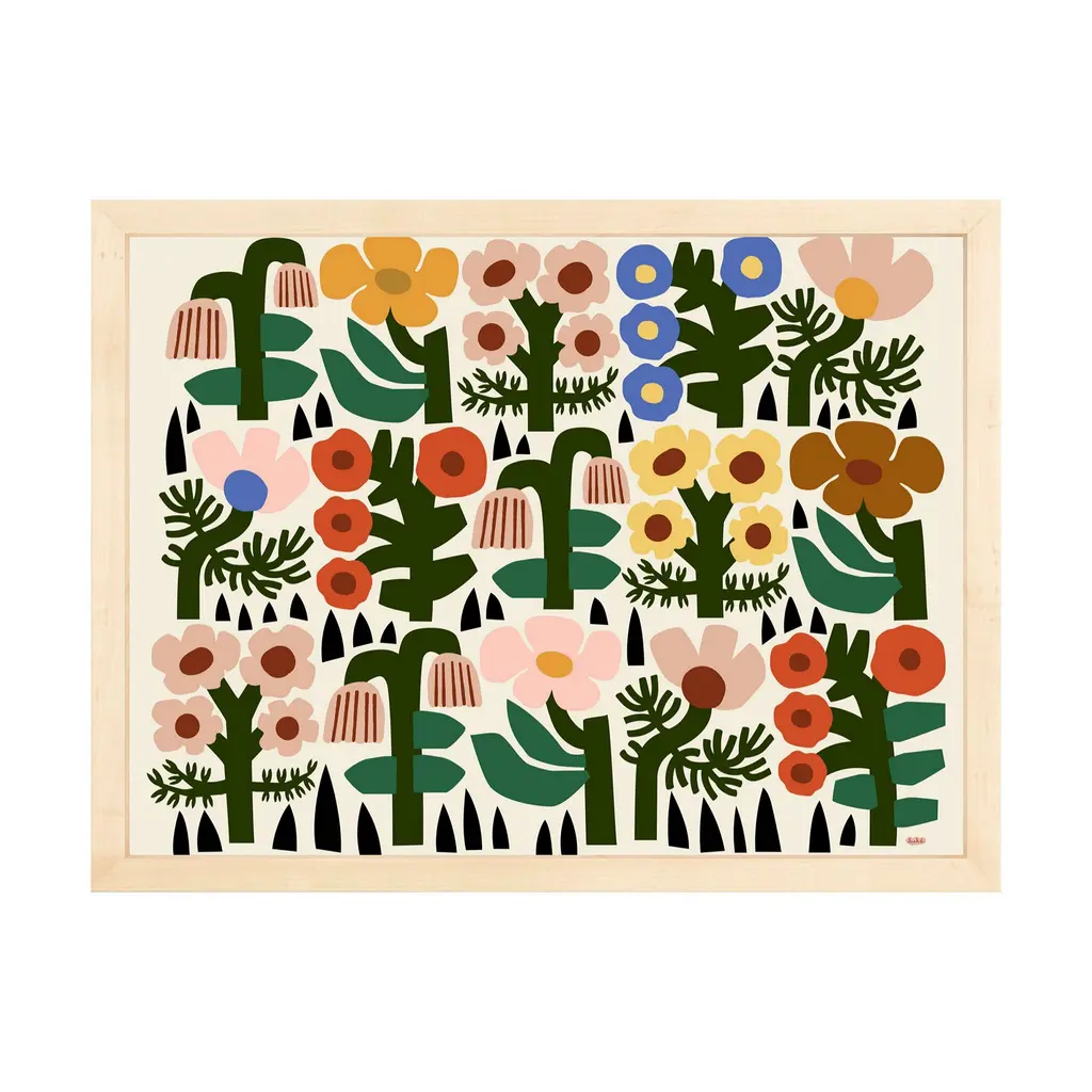 Original artwork by Leah Duncan. Blends modern and rustic appeal with its sleek wooden frame. The abstract design of modern, blocky florals. Easy to hang with the included hardware.