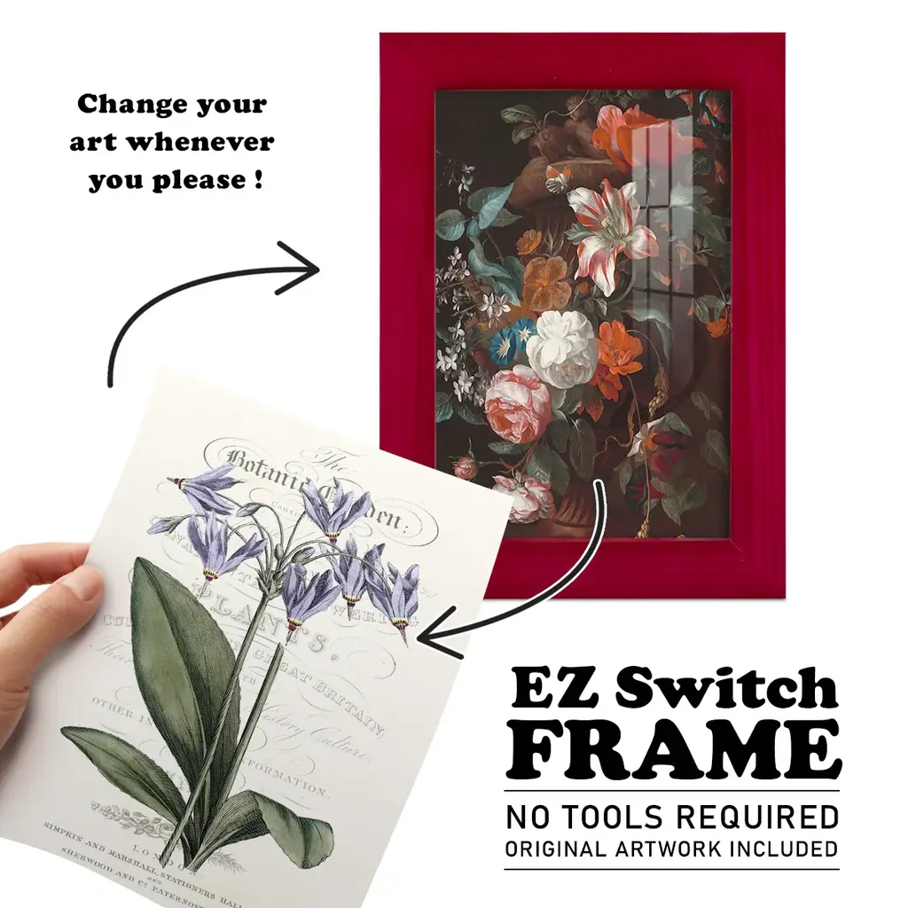 Flower Garden Varietals I -EZ SWITCH Framed Print w/glass-Cherry Red A delightful, framed print. Featuring a solid wood frame with real wood glass. This premium print is giclee quality. In addition, every frame features a removable back and table top stand. This allows you to change your art in the future or to just stand the art on a table for a new look. We are sure you'll enjoy our new series of EZ SWITCH Framed Art. Solid Wood Frame Real Glass Removable / Replaceable Art Built in Tabletop Stand Sizes range from 4x6 up to 12x15 - buy just one or pair them up as sets as you see fit.
