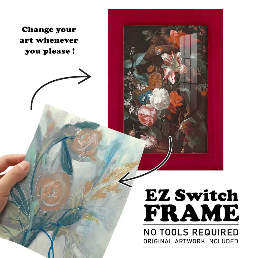 Flower Grouping II -EZ SWITCH Framed Print w/glass-Cherry Red A delightful, framed print. Featuring a solid wood frame with real wood glass. This premium print is giclee quality. In addition, every frame features a removable back and table top stand. This allows you to change your art in the future or to just stand the art on a table for a new look. We are sure you'll enjoy our new series of EZ SWITCH Framed Art. Solid Wood Frame Real Glass Removable / Replaceable Art Built in Tabletop Stand Sizes range from 4x6 up to 12x15 - buy just one or pair them up as sets as you see fit.