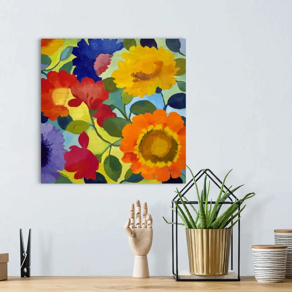 Painting of large, softly-styled flowers in warm colors and green leaves against a pale blue background