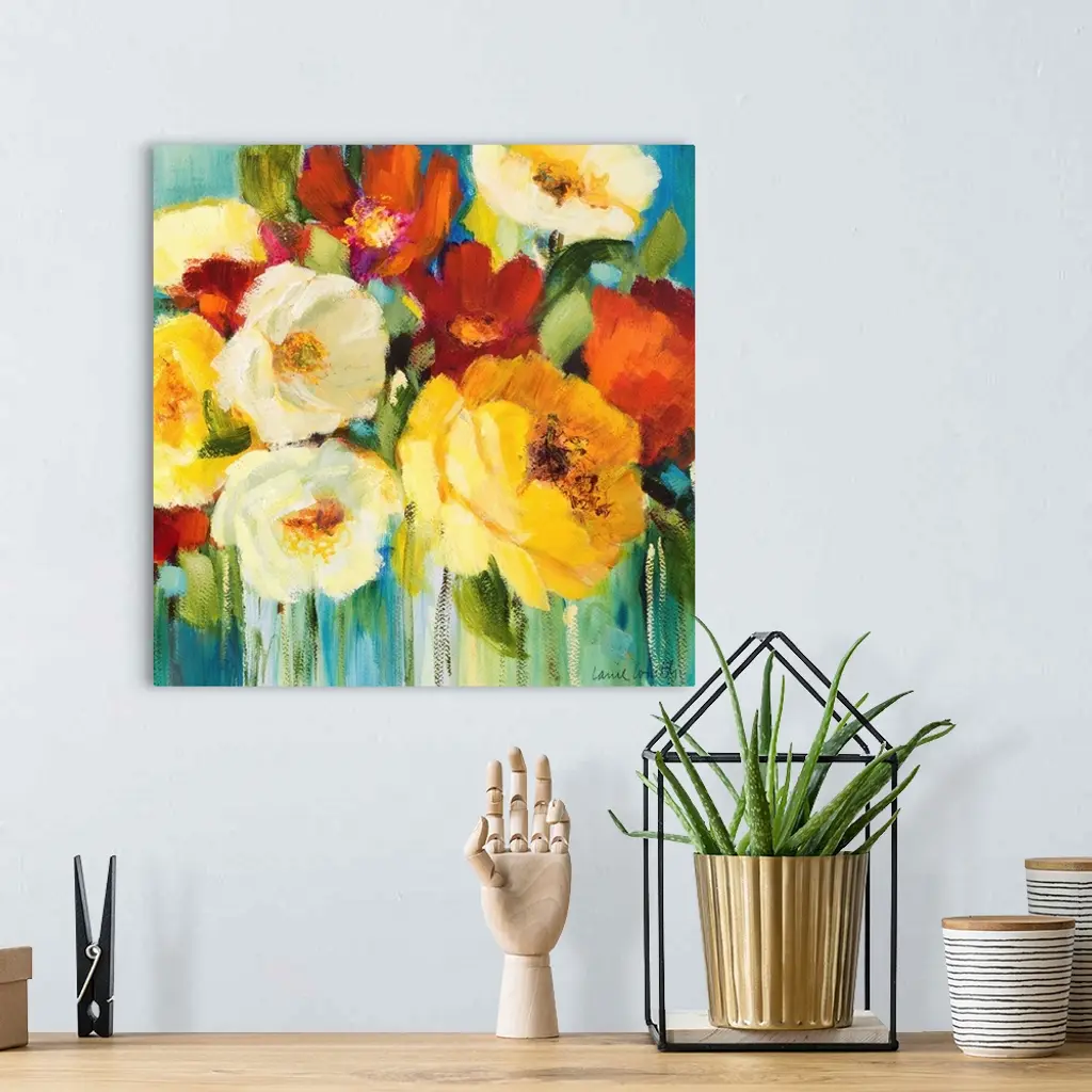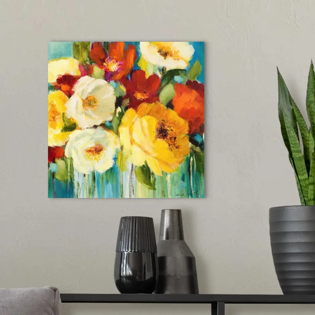 Contemporary painting of a bouquet of vibrant colored flowers.