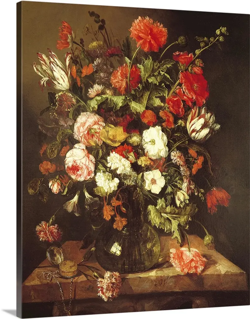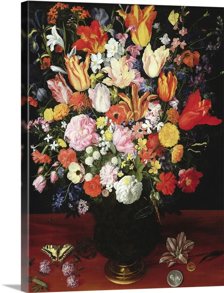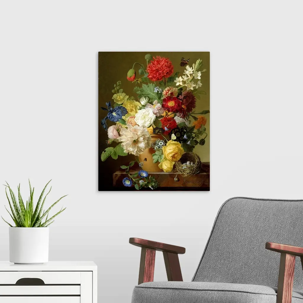 A nineteenth century still life painting of enormous floral blooms of many varieties, a birdos nest and butterfly.