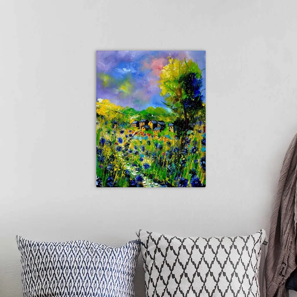 Vertical painting of a field of flowers with a house in the background with splatters of multi-color paint overlapping the image.