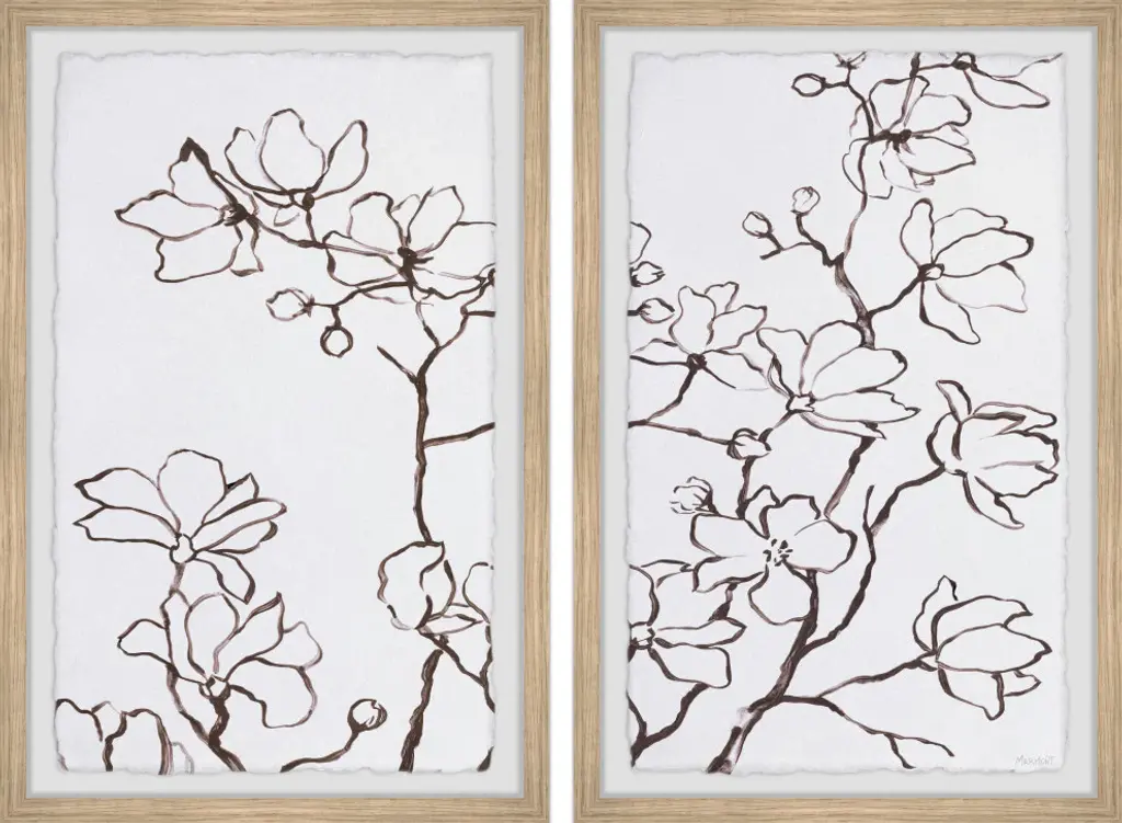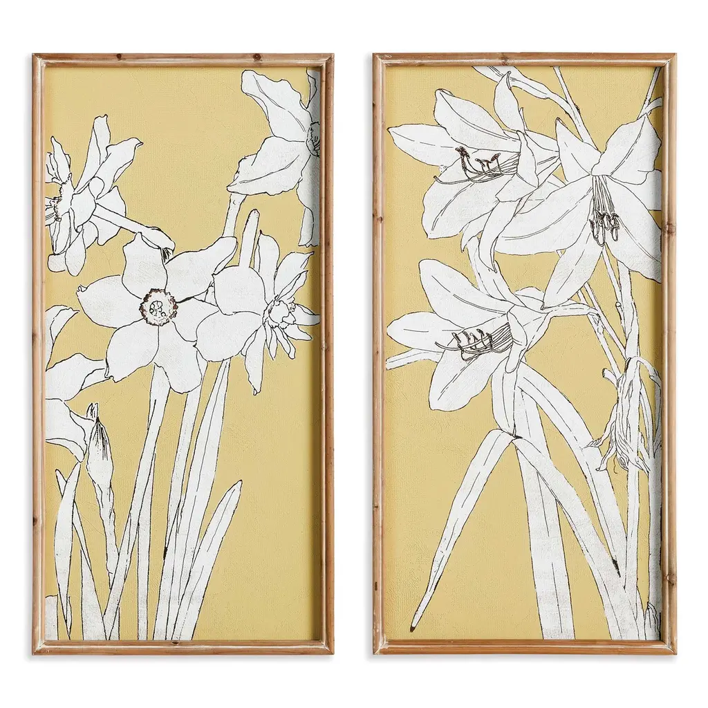 The muted yellow background of these flowering amaryllis prints is a clever nod to the signature Aurora amaryllis. A modern take on a traditional botanical composition. This well scaled diptych is finished off with whitewashed wood frames.