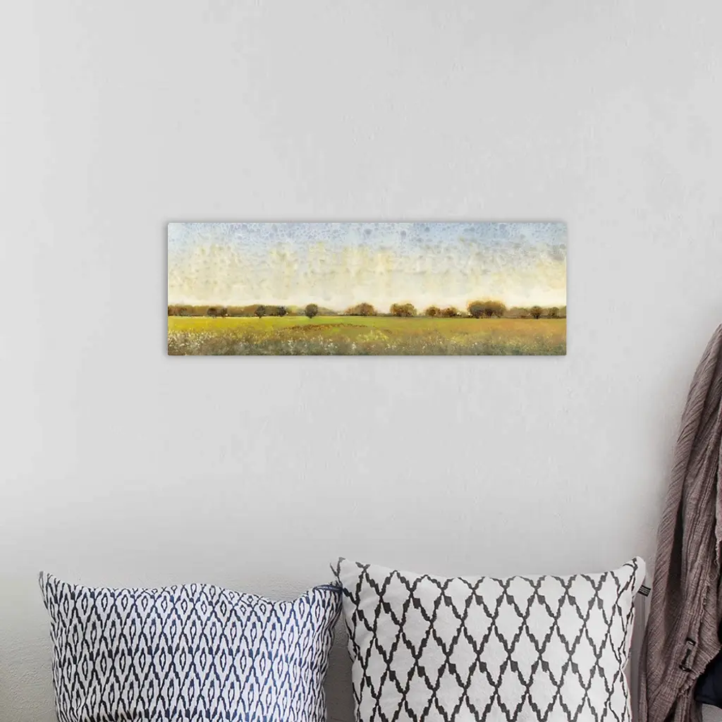 Contemporary painting of a meadow with trees in the distance.