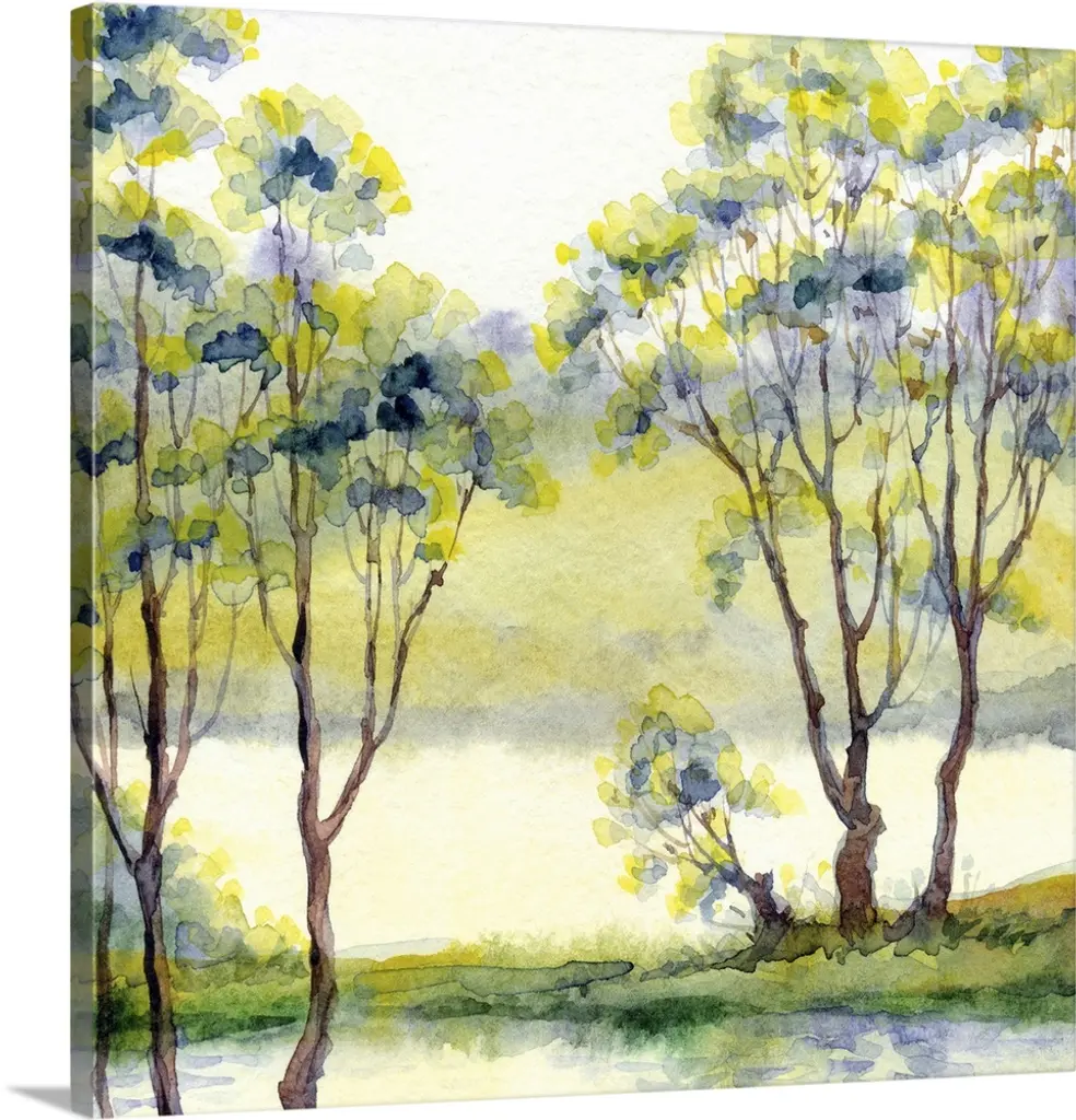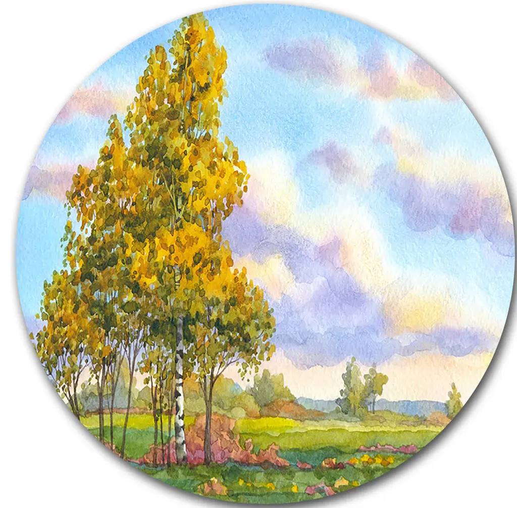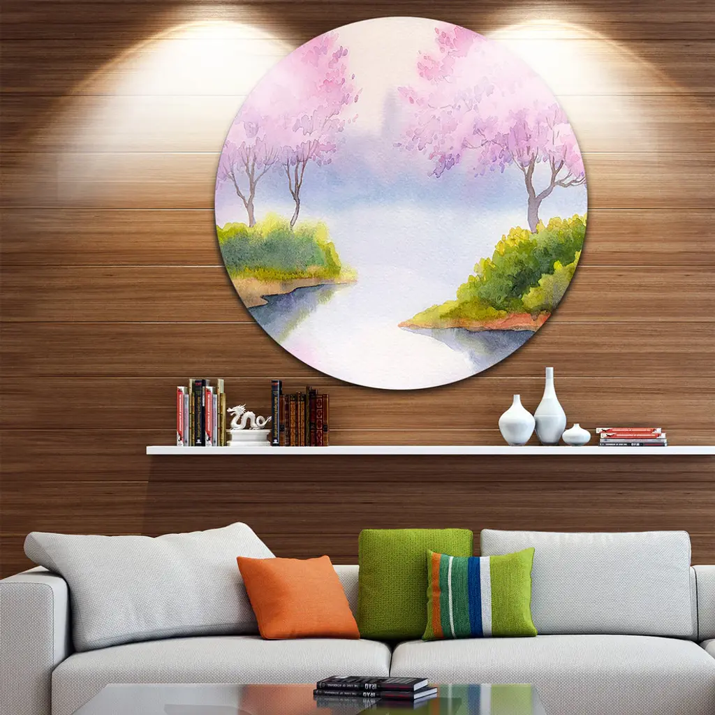 Flowering Trees Over River, Landscape Disc Metal Artwork, 23"