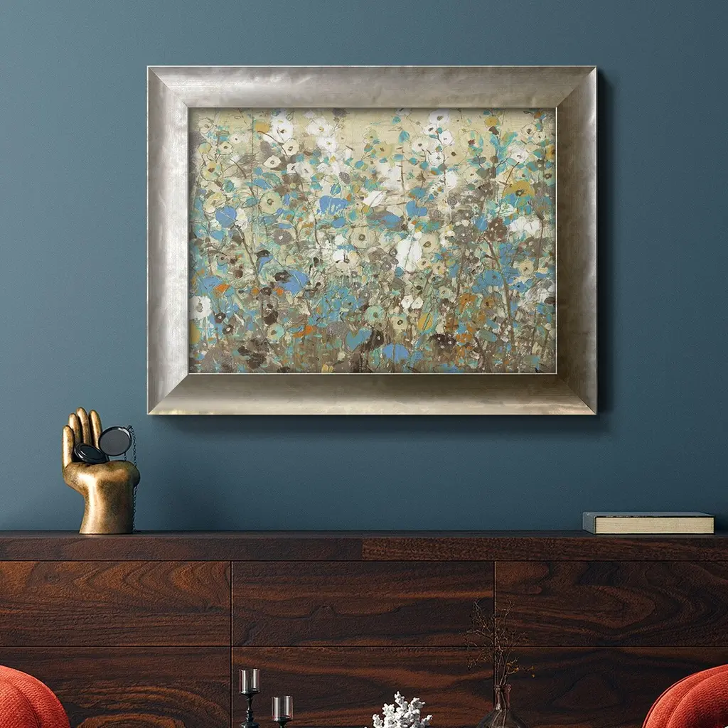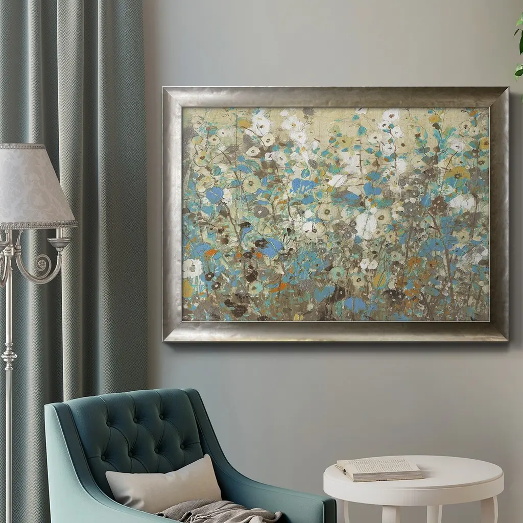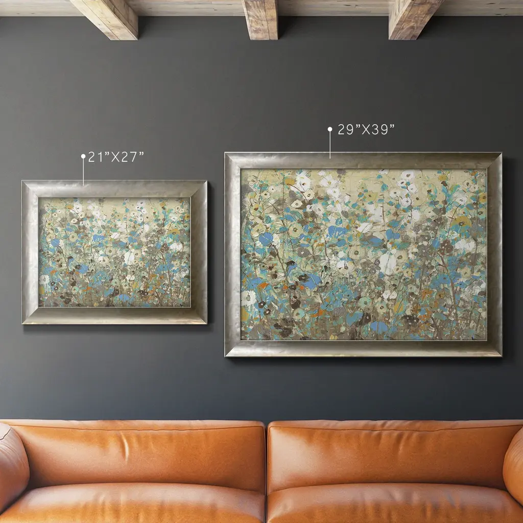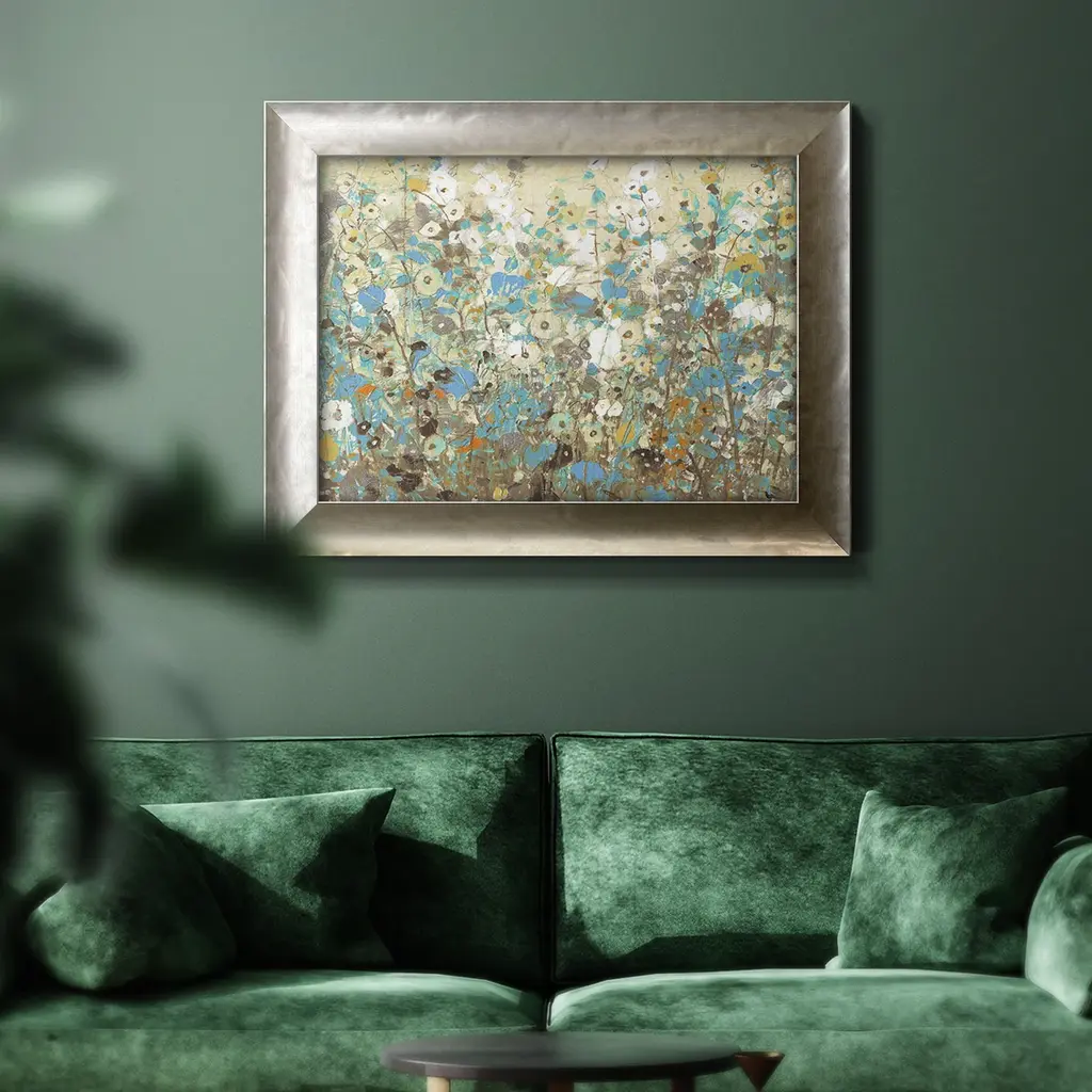 Flowering Vines I Premium Framed Canvas- Ready to Hang A Premium Framed Canvas created to last. Framed in distressed wood and available in an array of sizes and colors Featuring a beveled a solid wood stretcher bar, each piece comes ready to hand 3 SIZES AVAILABLE 16''X20'' - Overall Size 18'X27'' - Overall Size 24''x36'' - Overall Size Each piece is made to order. Each piece comes with hanging hardware. Made in the USA Ready to Hang Giclee Paper Print Acrylic Glass Beveled Matt Board