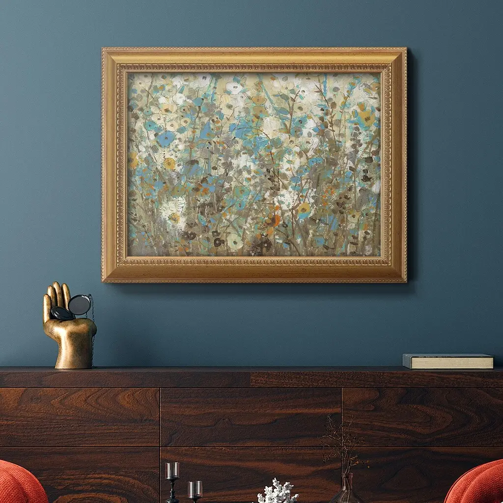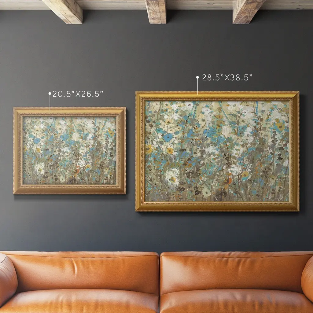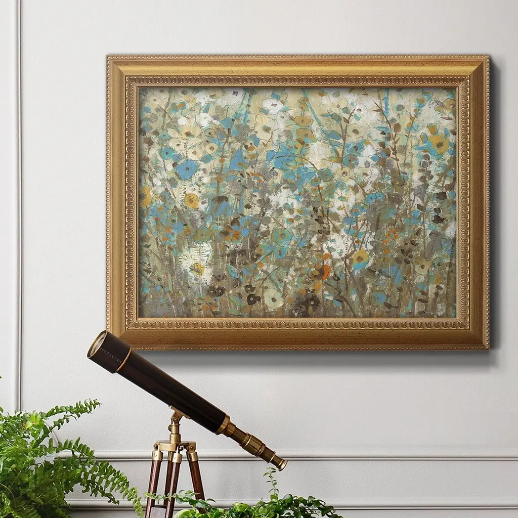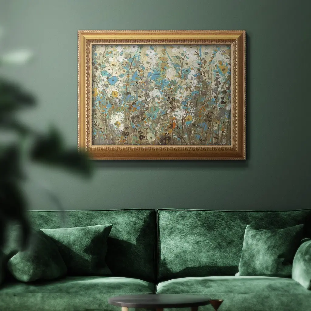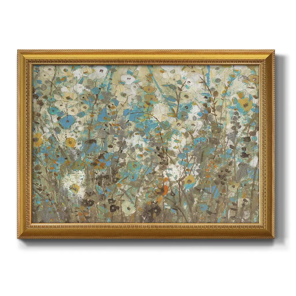 Flowering Vines II Premium Framed Canvas- Ready to Hang A Premium Framed Canvas created to last. Framed in distressed wood and available in an array of sizes and colors Featuring a beveled a solid wood stretcher bar, each piece comes ready to hand 3 SIZES AVAILABLE 16''X20'' - Overall Size 18'X27'' - Overall Size 24''x36'' - Overall Size Each piece is made to order. Each piece comes with hanging hardware. Made in the USA Ready to Hang Giclee Paper Print Acrylic Glass Beveled Matt Board