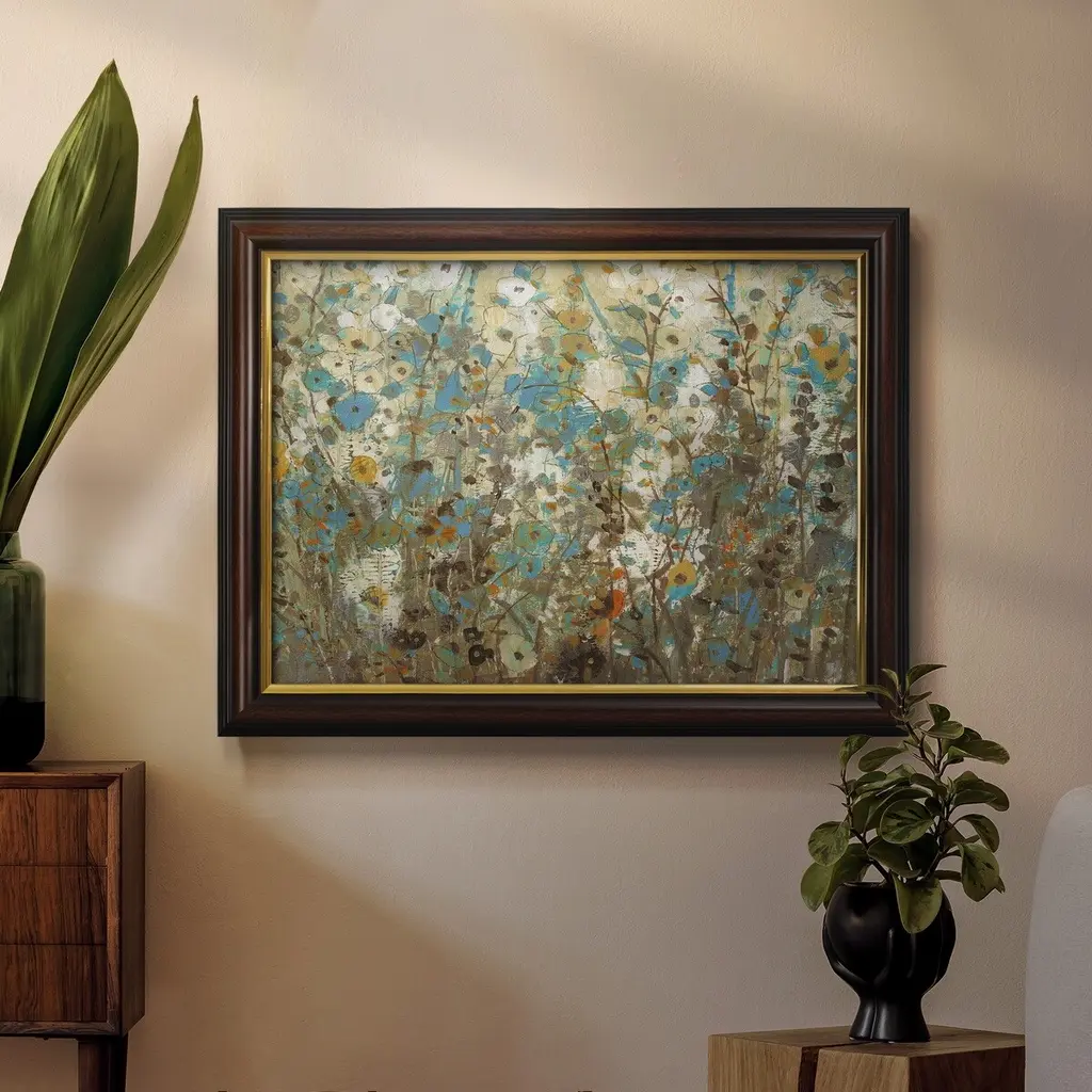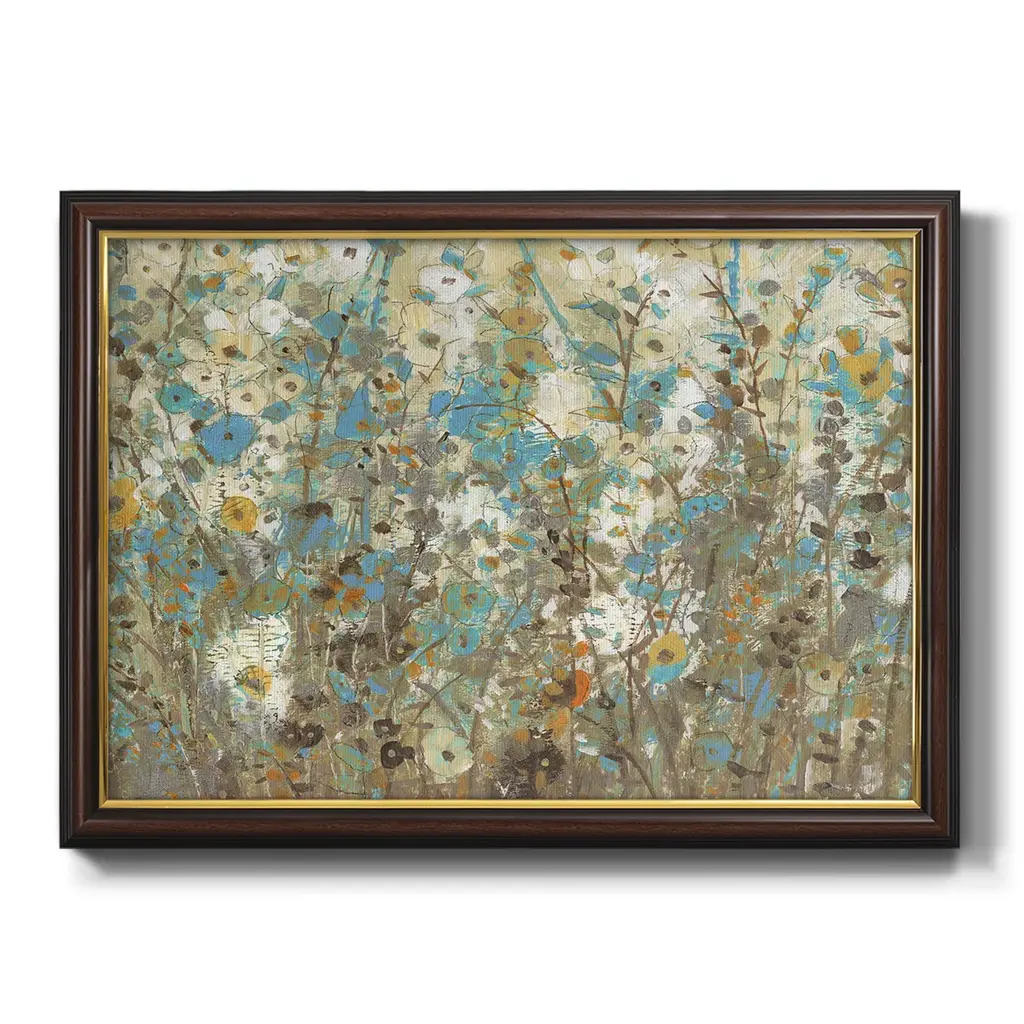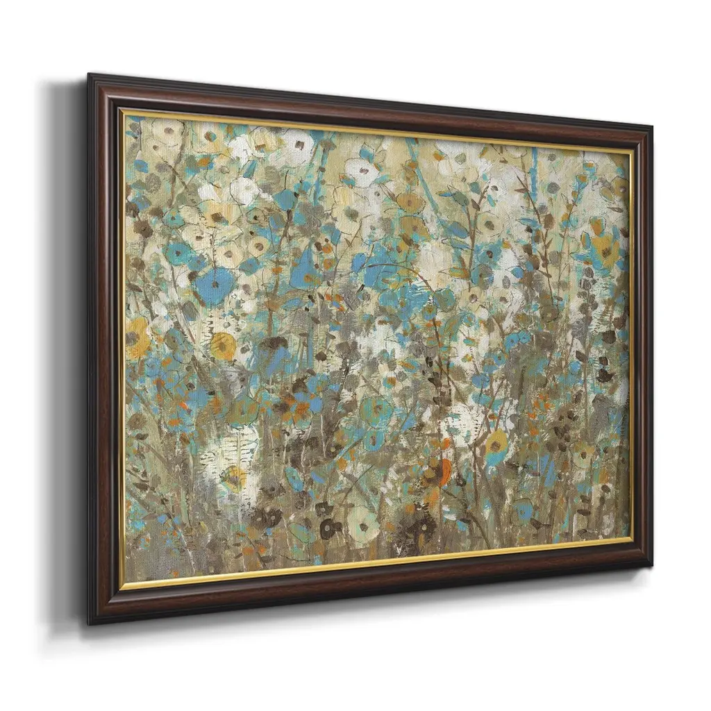 Flowering Vines II Premium Framed Canvas- Ready to Hang A Premium Framed Canvas created to last. Framed in distressed wood and available in an array of sizes and colors Featuring a beveled a solid wood stretcher bar, each piece comes ready to hand 3 SIZES AVAILABLE 16''X20'' - Overall Size 18'X27'' - Overall Size 24''x36'' - Overall Size Each piece is made to order. Each piece comes with hanging hardware. Made in the USA Ready to Hang Giclee Paper Print Acrylic Glass Beveled Matt Board