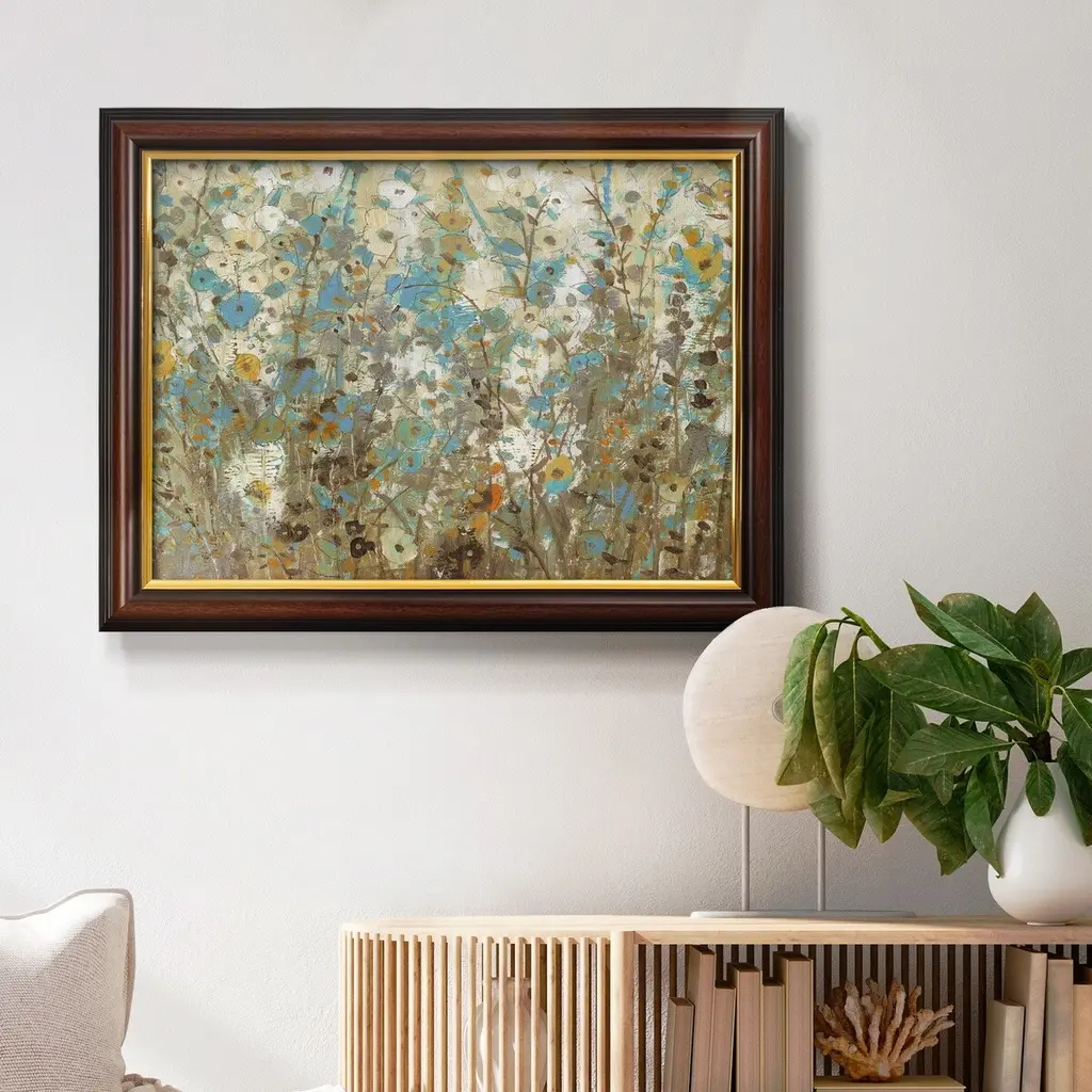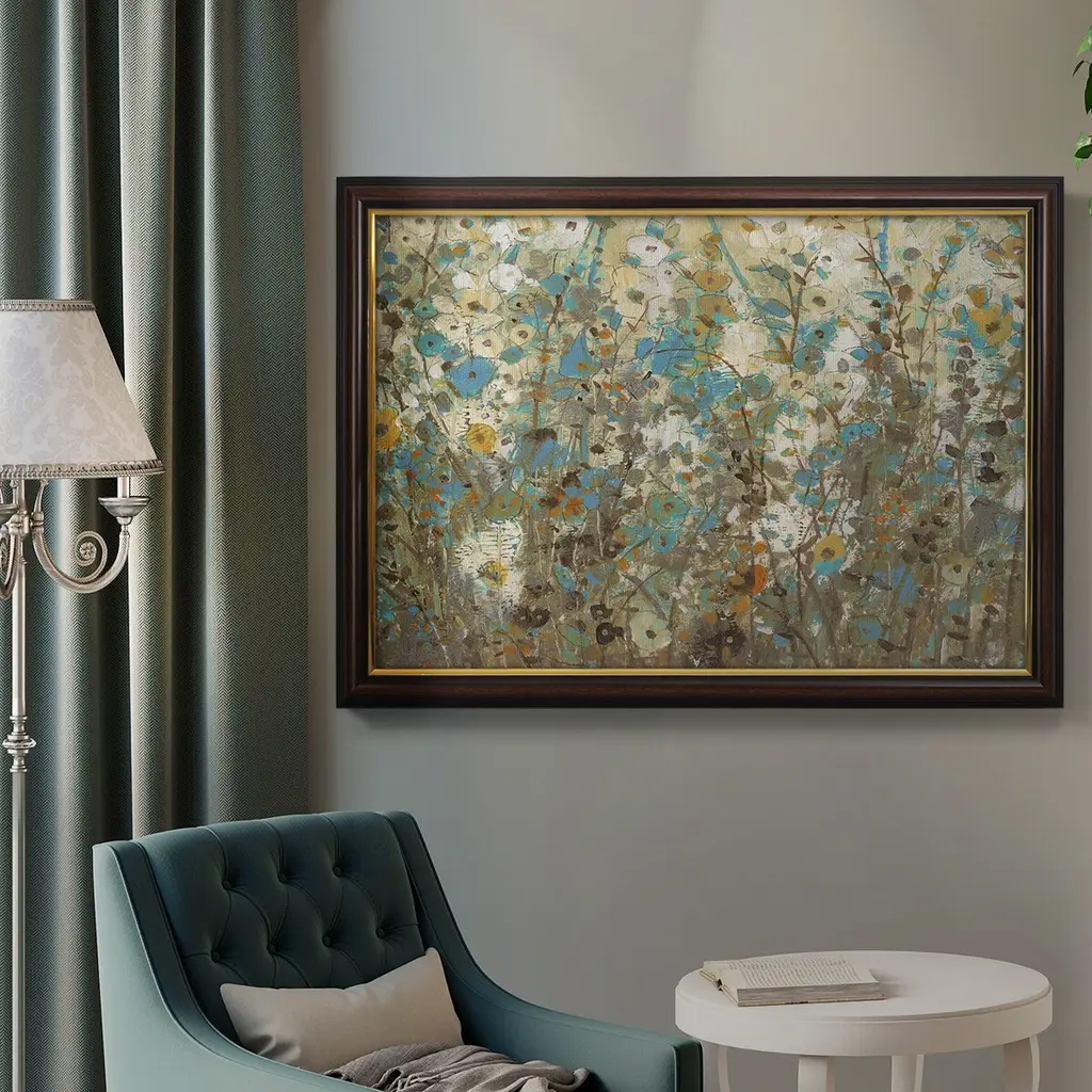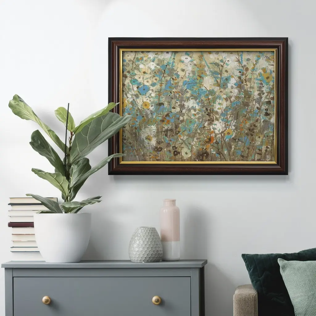 Flowering Vines II Premium Framed Canvas- Ready to Hang A Premium Framed Canvas created to last. Framed in distressed wood and available in an array of sizes and colors Featuring a beveled a solid wood stretcher bar, each piece comes ready to hand 3 SIZES AVAILABLE 16''X20'' - Overall Size 18'X27'' - Overall Size 24''x36'' - Overall Size Each piece is made to order. Each piece comes with hanging hardware. Made in the USA Ready to Hang Giclee Paper Print Acrylic Glass Beveled Matt Board