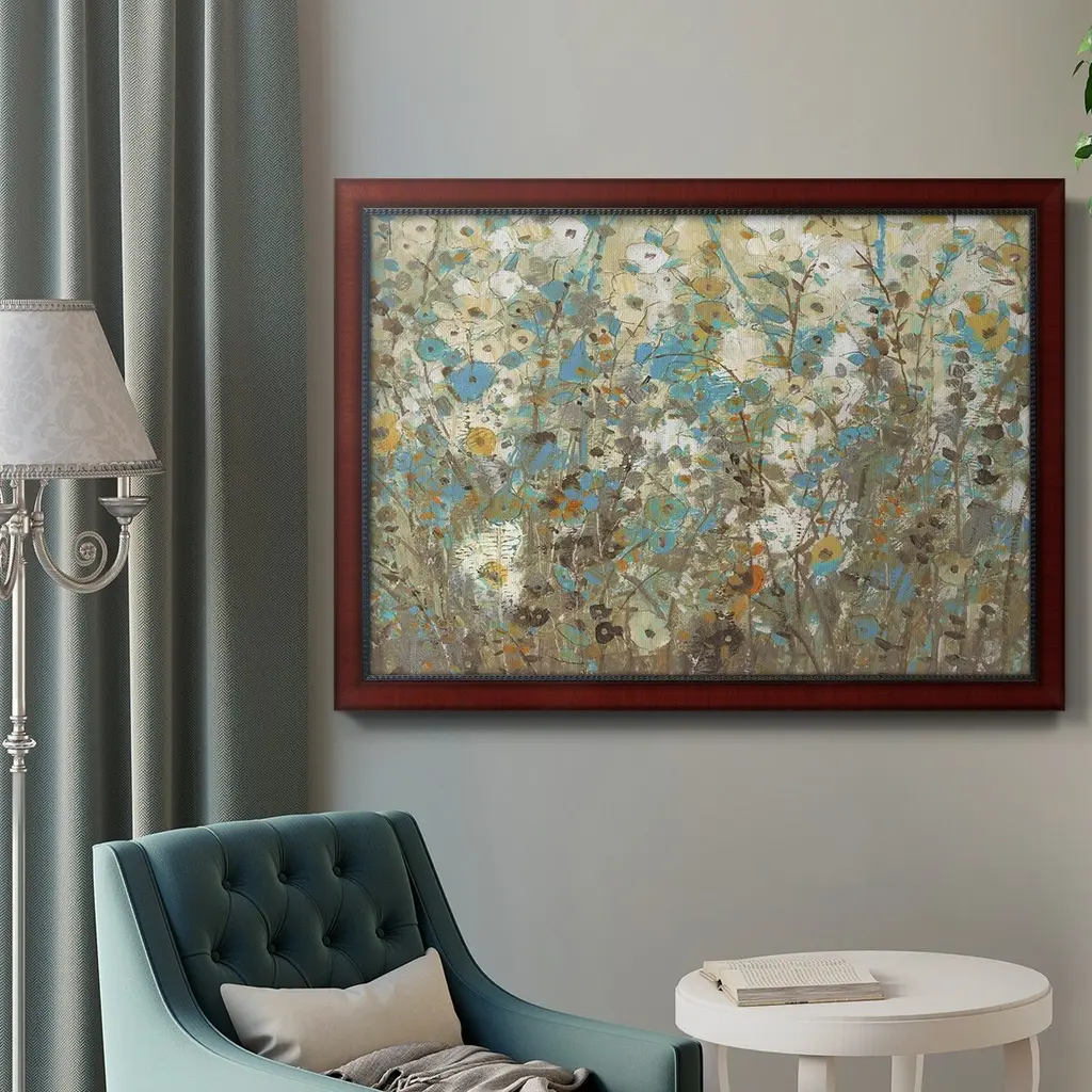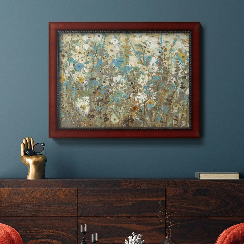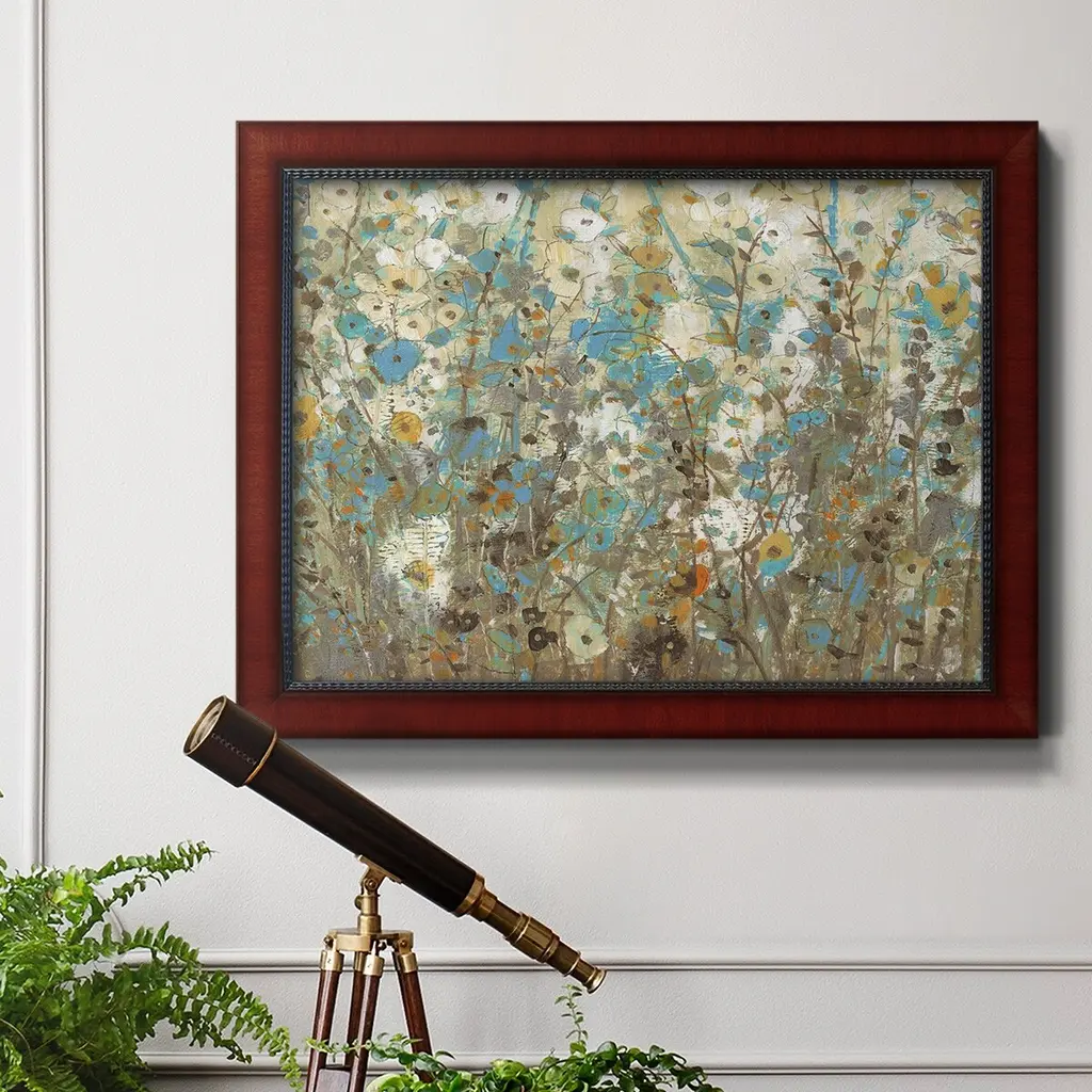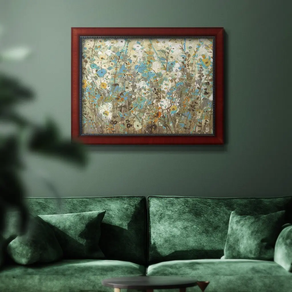 Flowering Vines II Premium Framed Canvas- Ready to Hang A Premium Framed Canvas created to last. Framed in distressed wood and available in an array of sizes and colors Featuring a beveled a solid wood stretcher bar, each piece comes ready to hand 3 SIZES AVAILABLE 16''X20'' - Overall Size 18'X27'' - Overall Size 24''x36'' - Overall Size Each piece is made to order. Each piece comes with hanging hardware. Made in the USA Ready to Hang Giclee Paper Print Acrylic Glass Beveled Matt Board