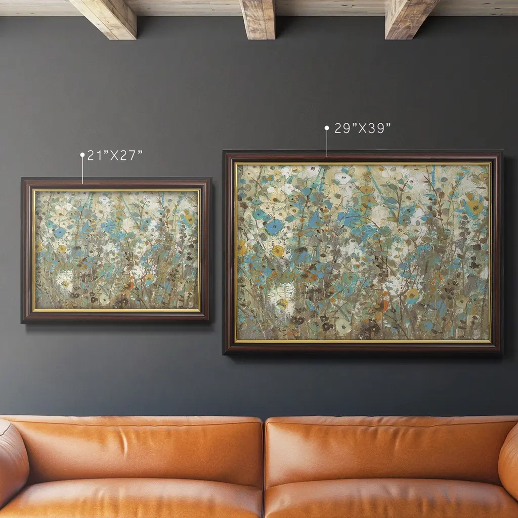 Flowering Vines II Premium Framed Canvas- Ready to Hang A Premium Framed Canvas created to last. Framed in distressed wood and available in an array of sizes and colors Featuring a beveled a solid wood stretcher bar, each piece comes ready to hand 3 SIZES AVAILABLE 16''X20'' - Overall Size 18'X27'' - Overall Size 24''x36'' - Overall Size Each piece is made to order. Each piece comes with hanging hardware. Made in the USA Ready to Hang Giclee Paper Print Acrylic Glass Beveled Matt Board