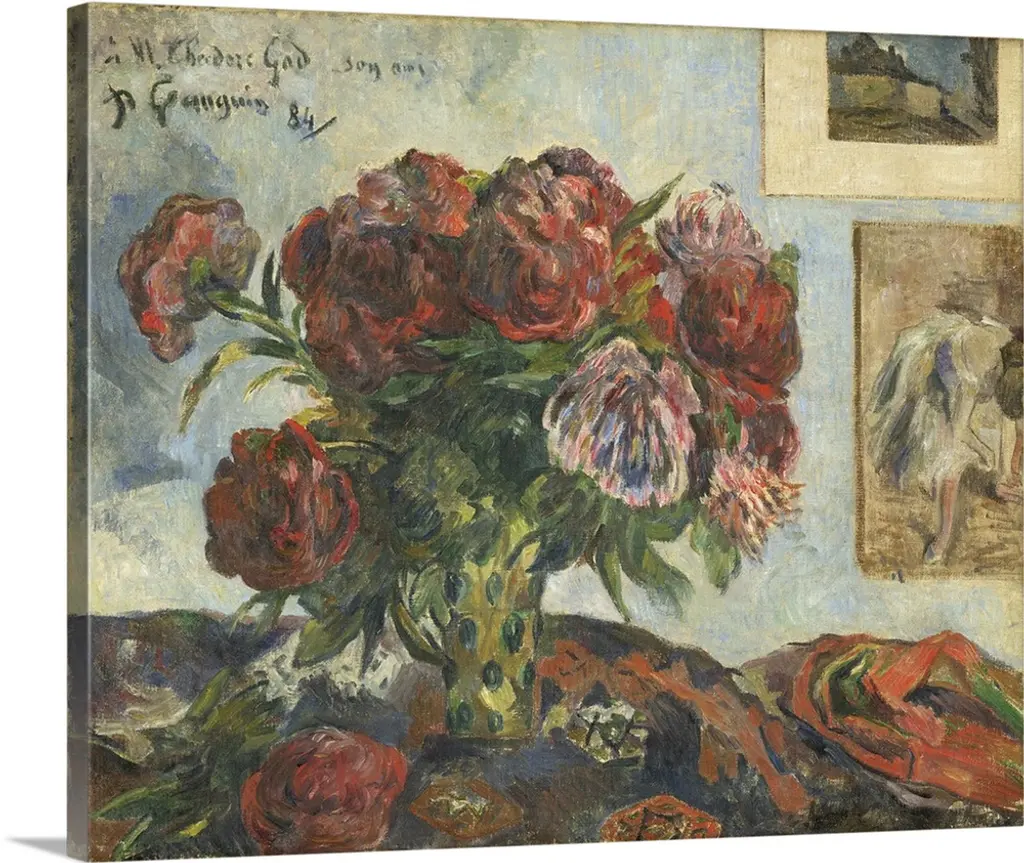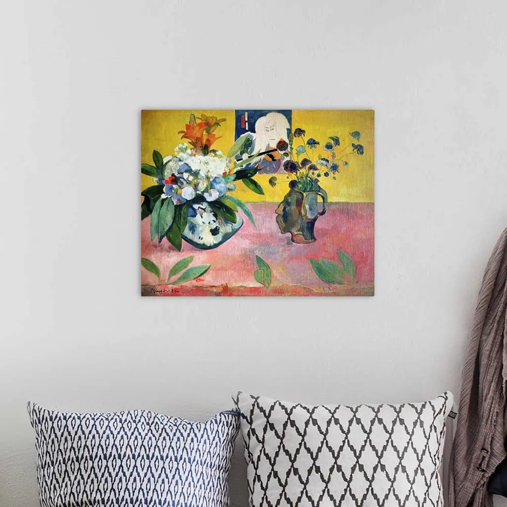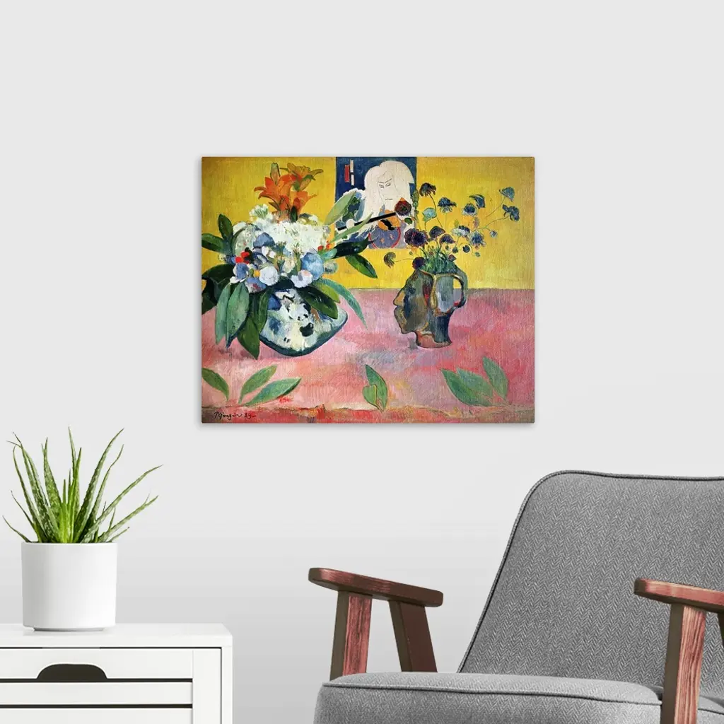 XIR66159 Flowers and a Japanese Print, 1889 (oil on canvas) by Gauguin, Paul (1848-1903); 85x115 cm; Private Collection; Giraudon; French, out of copyright