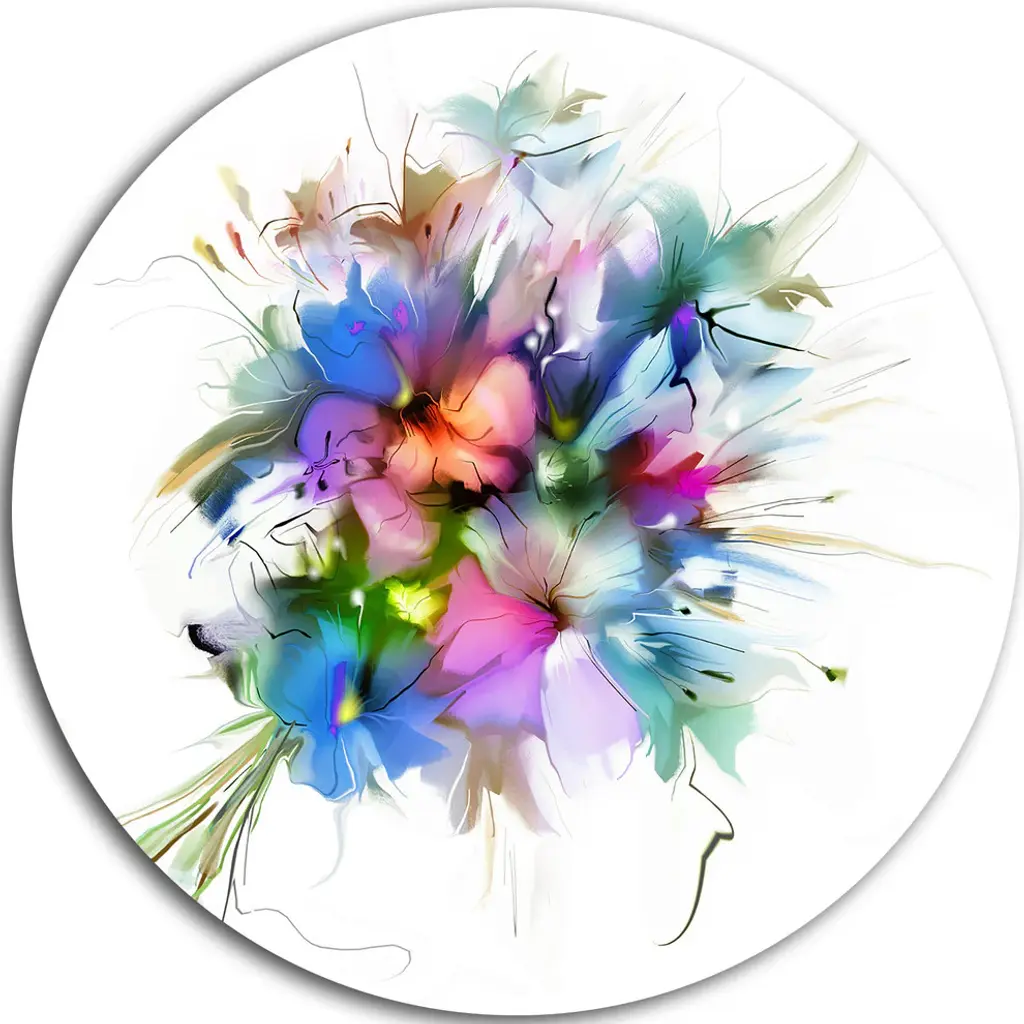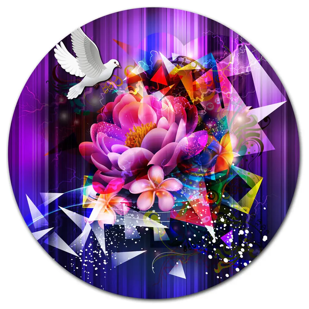 Bring Contemporary Abstraction to your home with this large Circle Metal wall art. This Flowers and Dove Abstract Design Metal Artwork makes it the focal point of any room or office. - White Gloss Coating ensures colors are extra vibrant with light reflection.- Aluminum grade Sheet Metal with 1 inch mounting frame on the back giving the illusion that the artwork is floating on the wall..- Mounting Brackets are included along with instructions.- High Quality Digital images are created directly into a glossy aluminum panel producing a stunning and captivating print into the glossy finish of the metal.- Water, Fire and Scratch resistant HD Aluminum panels.- Looks better than any photo paper and guaranteed to last at least 20 years- Easy to clean with a microfiber cloth. Colors are far superior to regular Canvas Art. - Easy to Hang