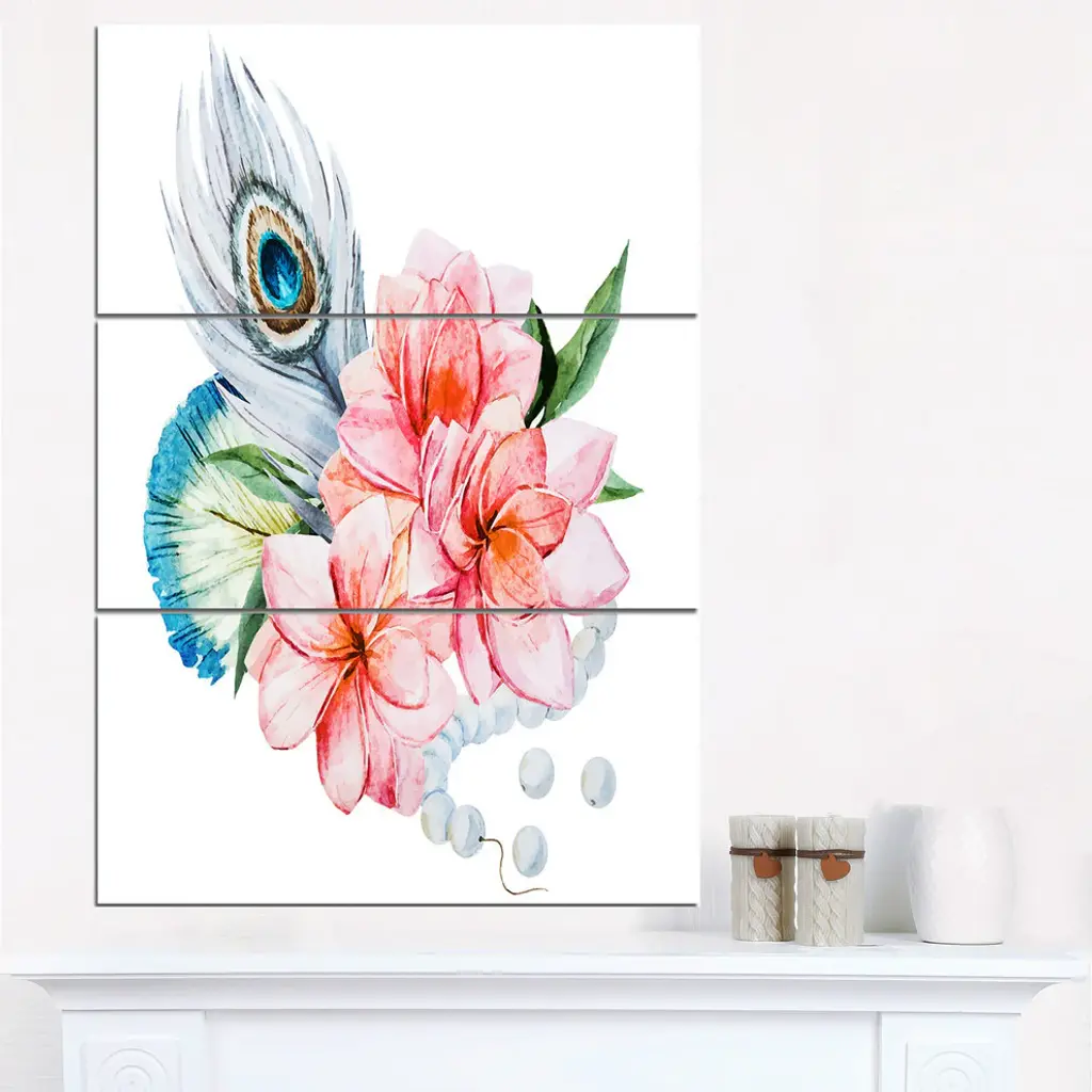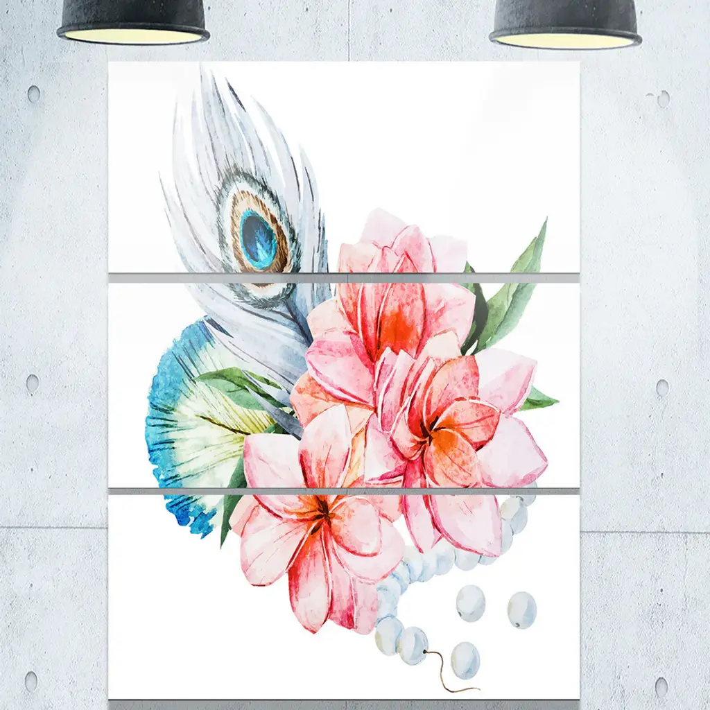 "Flowers And Peacock Feather" Glossy Metal Wall Art, 3 Panels, 28"x36"