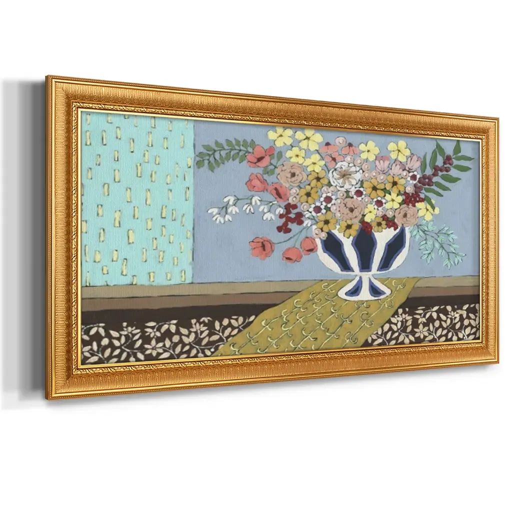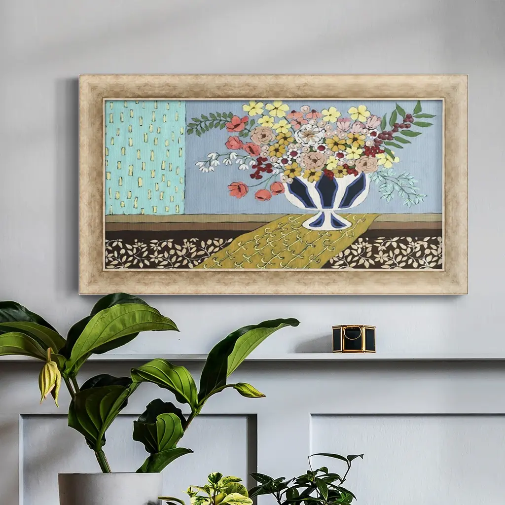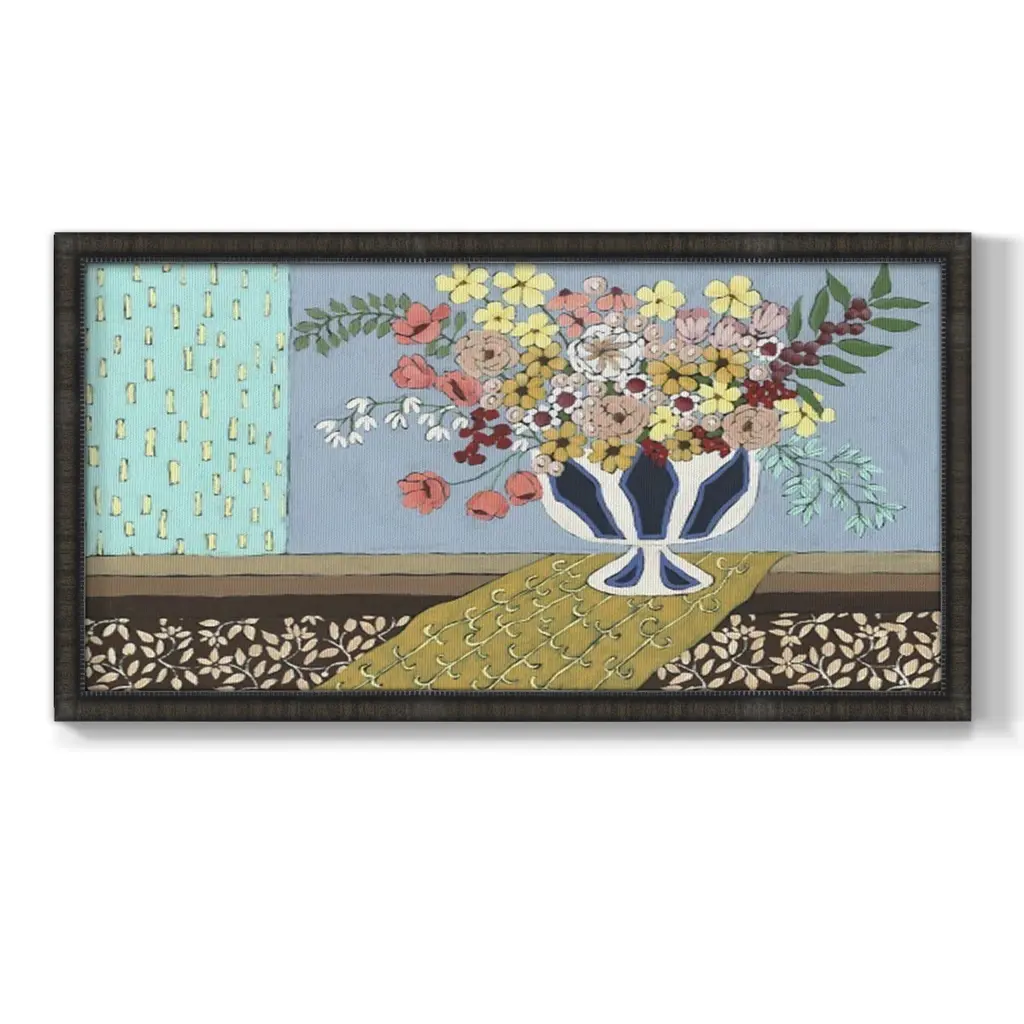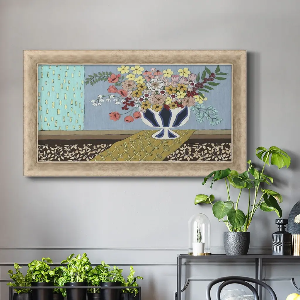Flowers Blooming Premium Framed Canvas- Ready to Hang A Premium Framed Canvas created to last. Framed in distressed wood and available in an array of sizes and colors Featuring a beveled a solid wood stretcher bar, each piece comes ready to hand 3 SIZES AVAILABLE 21''X37'' - Overall Size 25''X45'' - Overall Size 29''x53'' - Overall Size Each piece is made to order. Each piece comes with hanging hardware. Made in the USA Ready to Hang Giclee Paper Print Acrylic Glass Beveled Matt Board