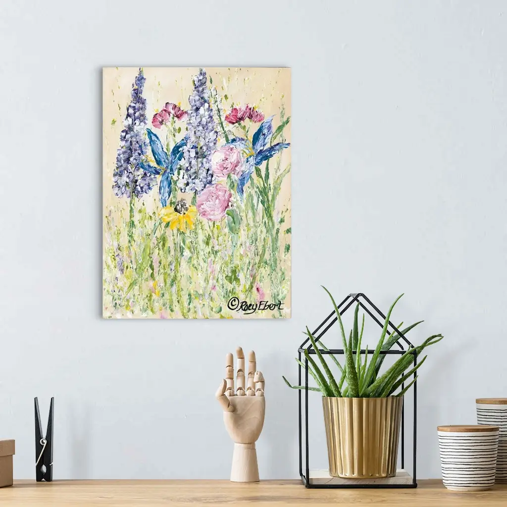 An vertical contemporary painting of wild flowers with an organic textured quality.