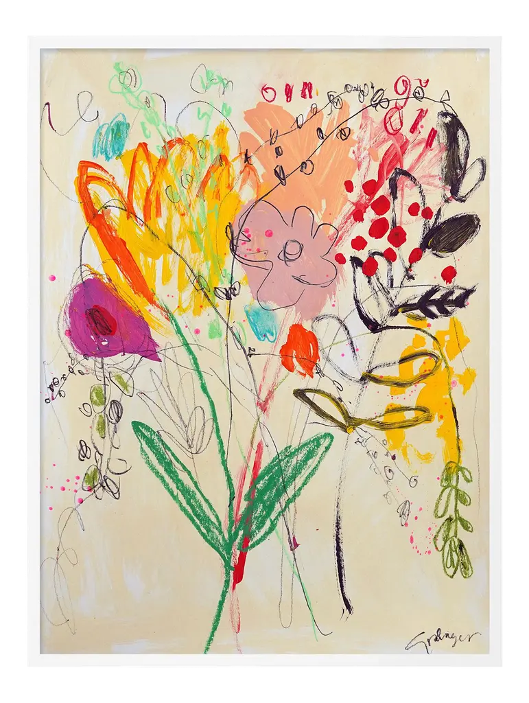 DESCRIPTION: Flowers for Her by Lesley Grainger in White Frame, Small Art Print SPECIFICATIONS: Type: Framed Paper. Framed Size (in): 18x24. Orientation: Vertical. Flush/Float/Matted: Flush. Frame Color: White. Hanging Hardware: Picture Perfect. FRAMING: Each art work arrives framed and ready to hang. We use handmade frames with a plexiglass glazing front, because it offers less glare than standard glass. At this time, we only offer framed prints. ARTIST BIO: Lesley Grainger was born in Yorkshire, England, where she grew up in a small Northern fishing town and currently resides in Orange County, California. She received a B.A. in Illustration and Design from the University of Lincoln. Early in her career, she worked as graphic designer and later began to produce children’s books and licensed artwork. For the last several years her main focus and passion has been abstract painting. She works intuitively and thoughtfully while discovering new and interesting colors and compositions. Painting is a reflection of experience and what Lesley has found is that each painting is translated to the next, like an ongoing story. Discovery is key in Lesley's expression, as she works with the canvas, adding and removing elements. This pushes her to new levels and brings a sense of how art can change the way we think, feel, and connect with the world.