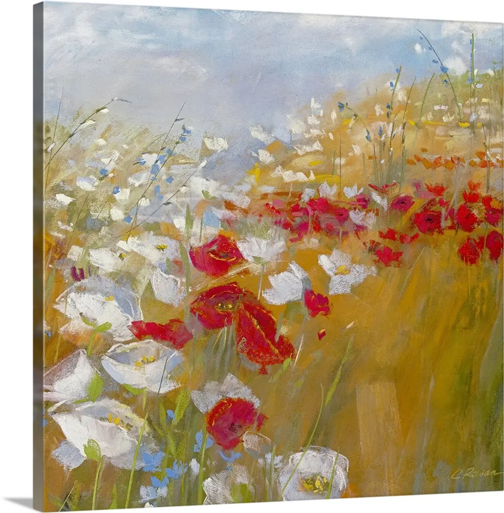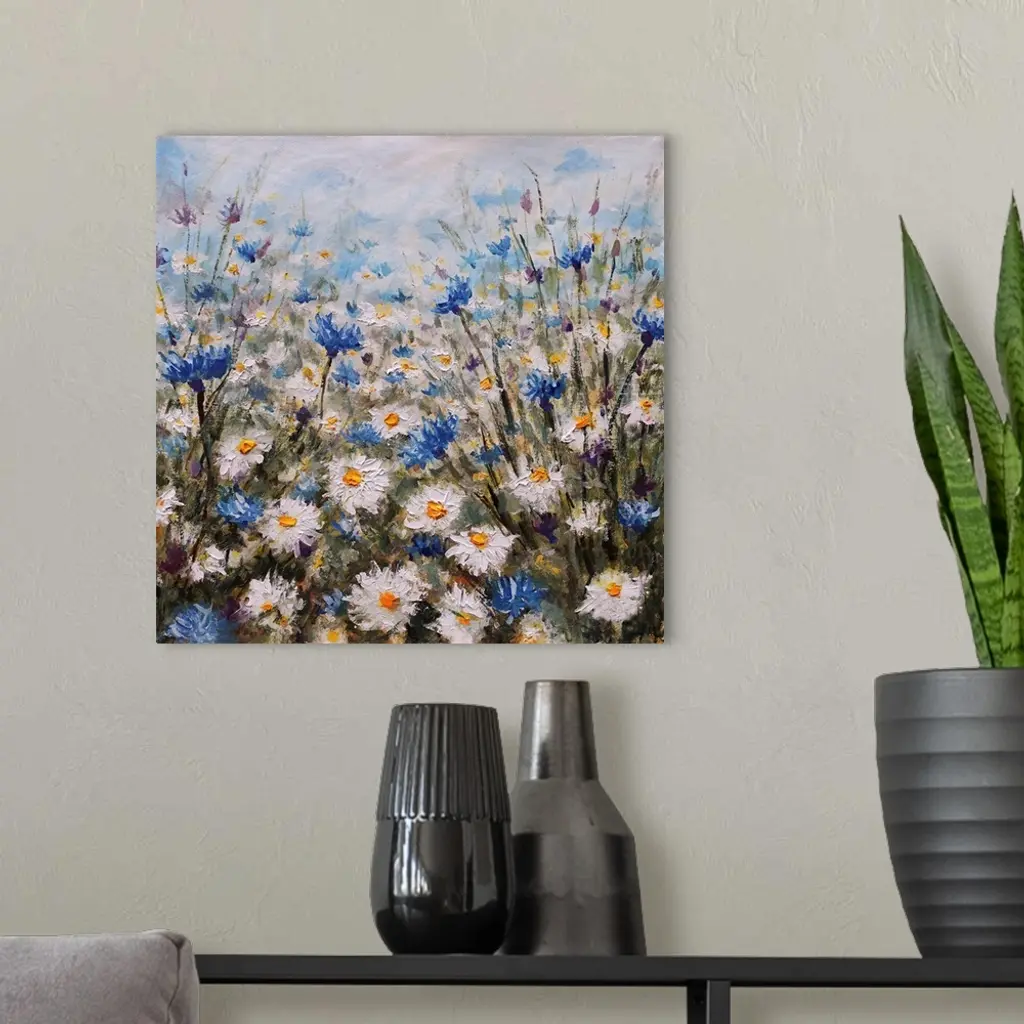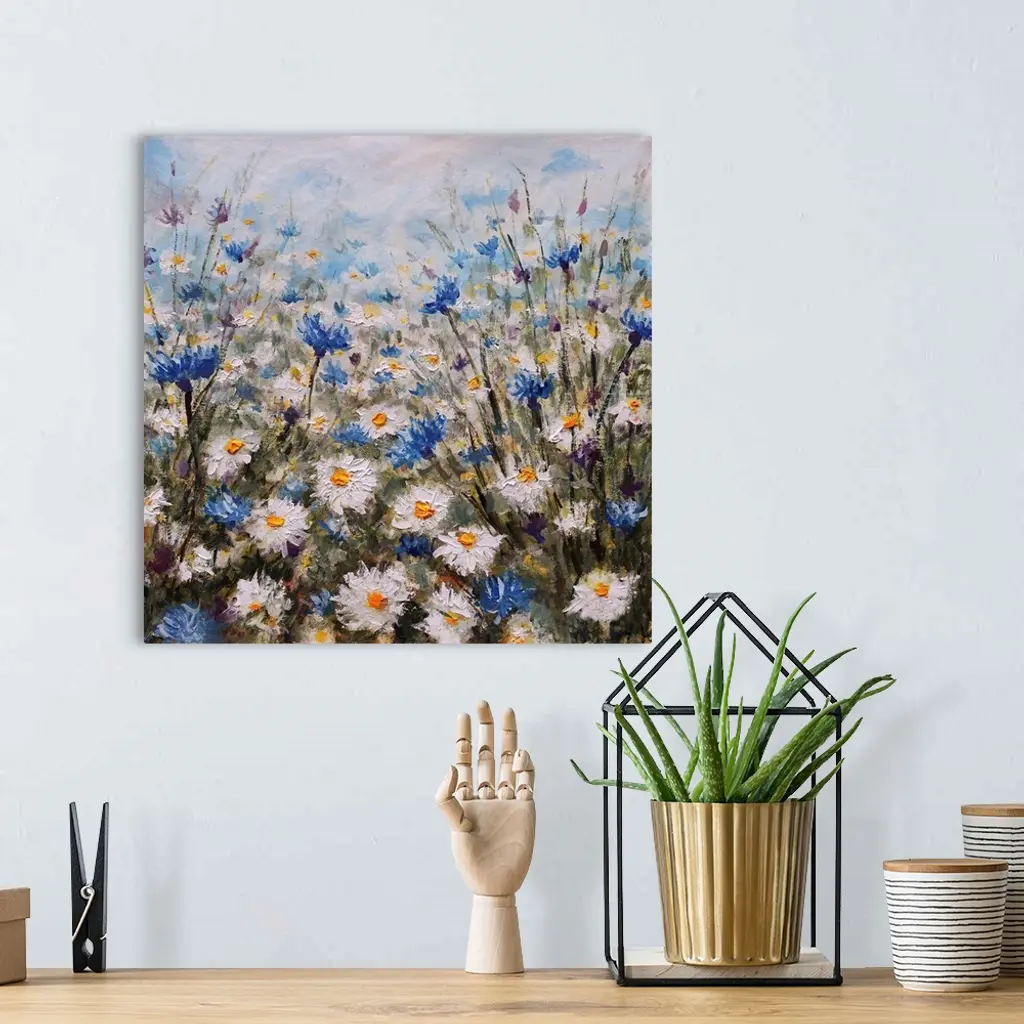 Flowers. Field of white flowers. Glade of cornflowers and daisies. Summer flowers. Grass. Nature. Originally an oil painting on canvas. Modern impressionism.