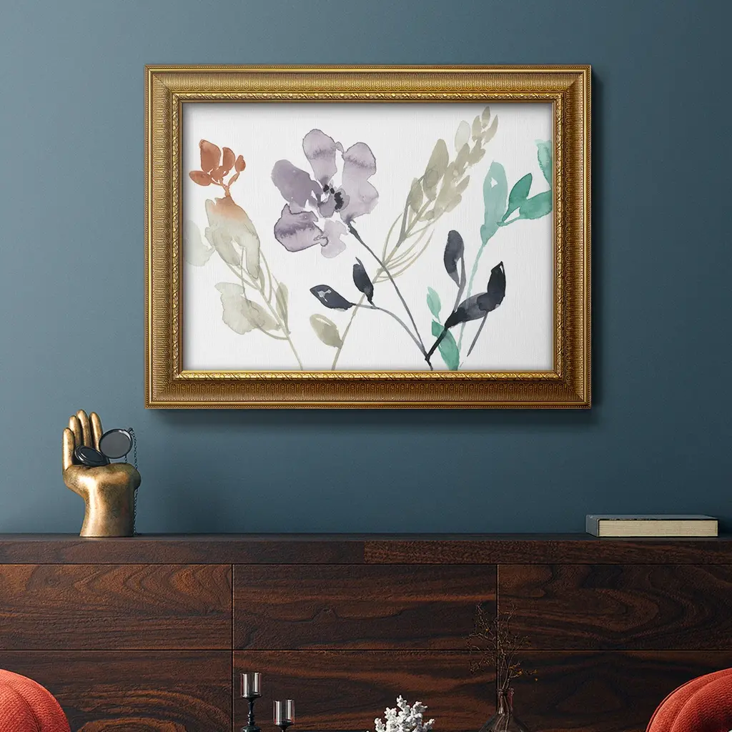 Flowers in Fall I Premium Framed Canvas- Ready to Hang A Premium Framed Canvas created to last. Framed in distressed wood and available in an array of sizes and colors Featuring a beveled a solid wood stretcher bar, each piece comes ready to hand 3 SIZES AVAILABLE 16''X20'' - Overall Size 18'X27'' - Overall Size 24''x36'' - Overall Size Each piece is made to order. Each piece comes with hanging hardware. Made in the USA Ready to Hang Giclee Paper Print Acrylic Glass Beveled Matt Board