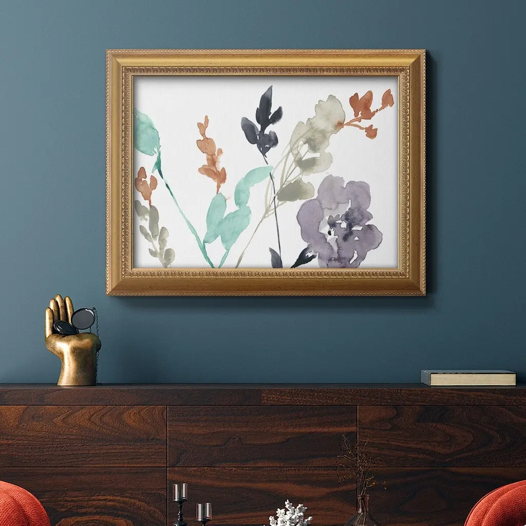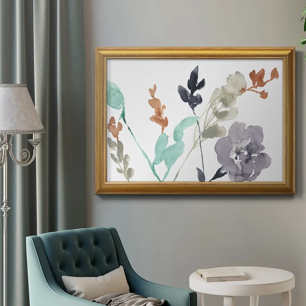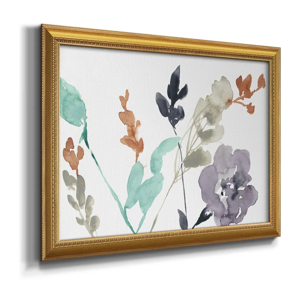 Flowers in Fall II Premium Framed Canvas- Ready to Hang A Premium Framed Canvas created to last. Framed in distressed wood and available in an array of sizes and colors Featuring a beveled a solid wood stretcher bar, each piece comes ready to hand 3 SIZES AVAILABLE 16''X20'' - Overall Size 18'X27'' - Overall Size 24''x36'' - Overall Size Each piece is made to order. Each piece comes with hanging hardware. Made in the USA Ready to Hang Giclee Paper Print Acrylic Glass Beveled Matt Board