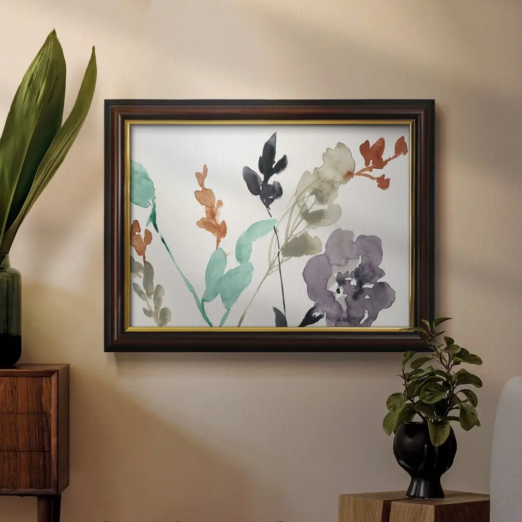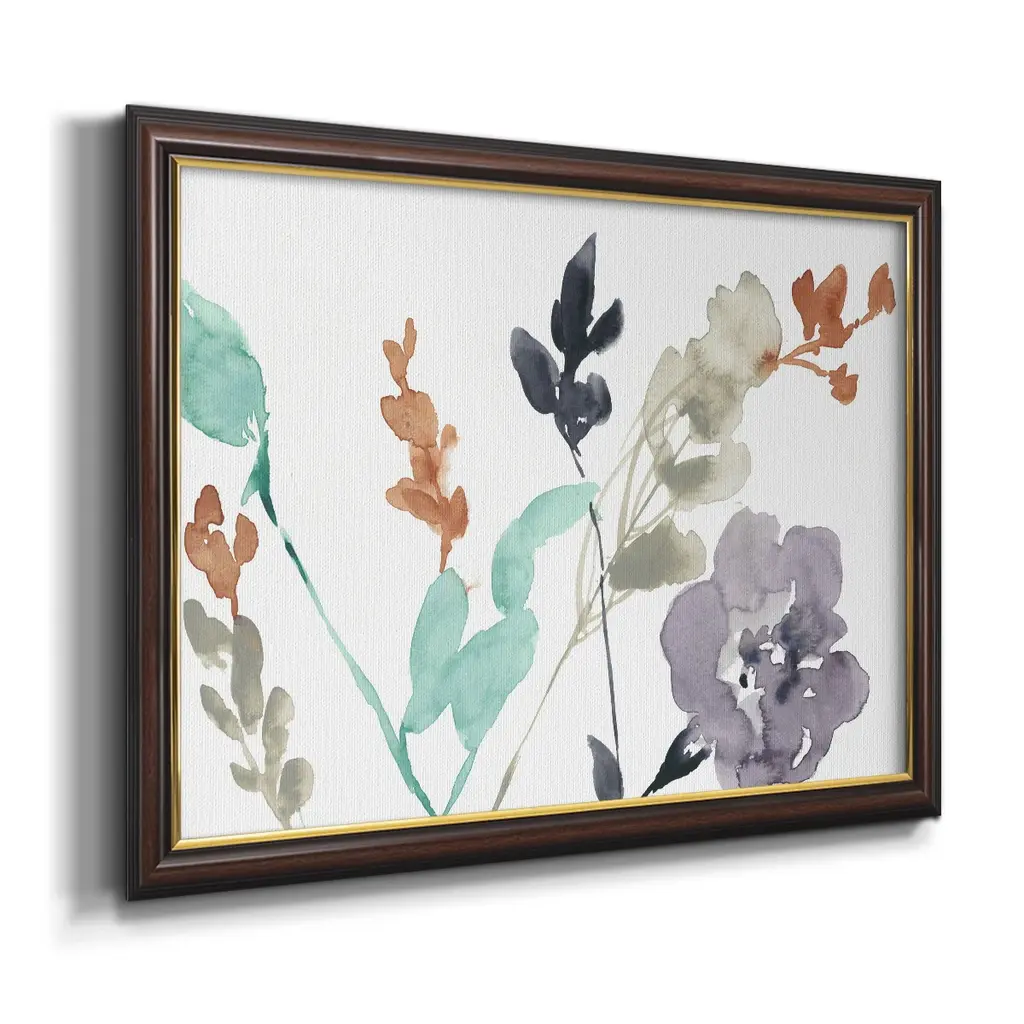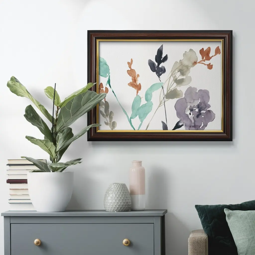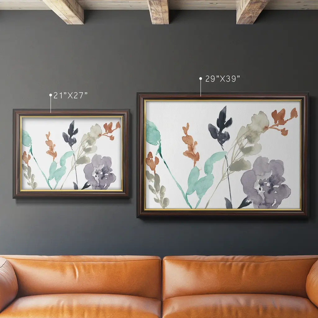 Flowers in Fall II Premium Framed Canvas- Ready to Hang A Premium Framed Canvas created to last. Framed in distressed wood and available in an array of sizes and colors Featuring a beveled a solid wood stretcher bar, each piece comes ready to hand 3 SIZES AVAILABLE 16''X20'' - Overall Size 18'X27'' - Overall Size 24''x36'' - Overall Size Each piece is made to order. Each piece comes with hanging hardware. Made in the USA Ready to Hang Giclee Paper Print Acrylic Glass Beveled Matt Board