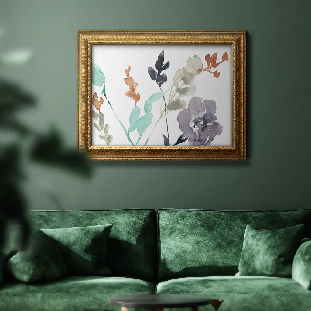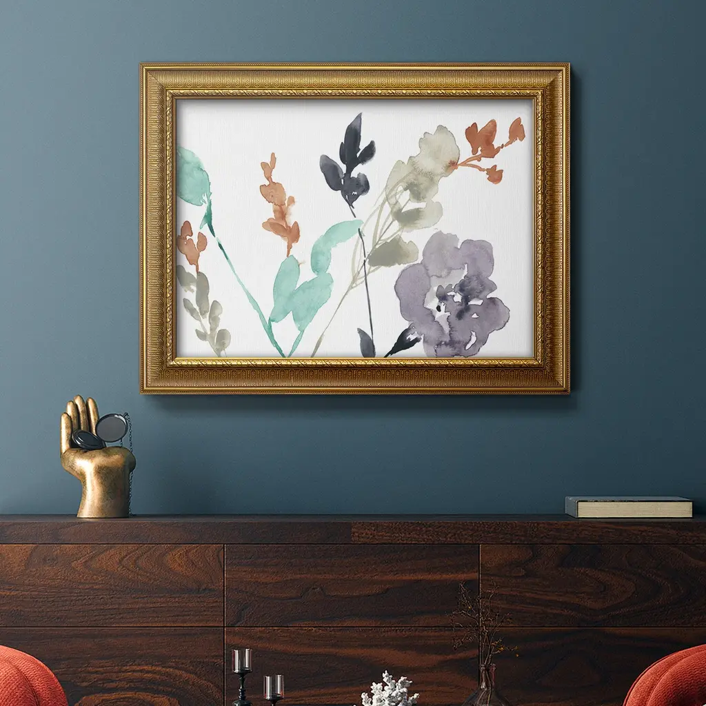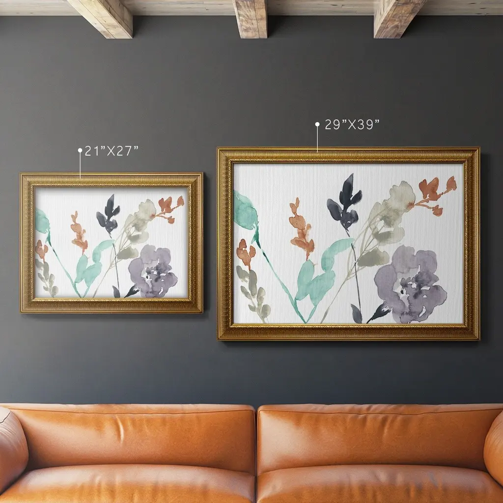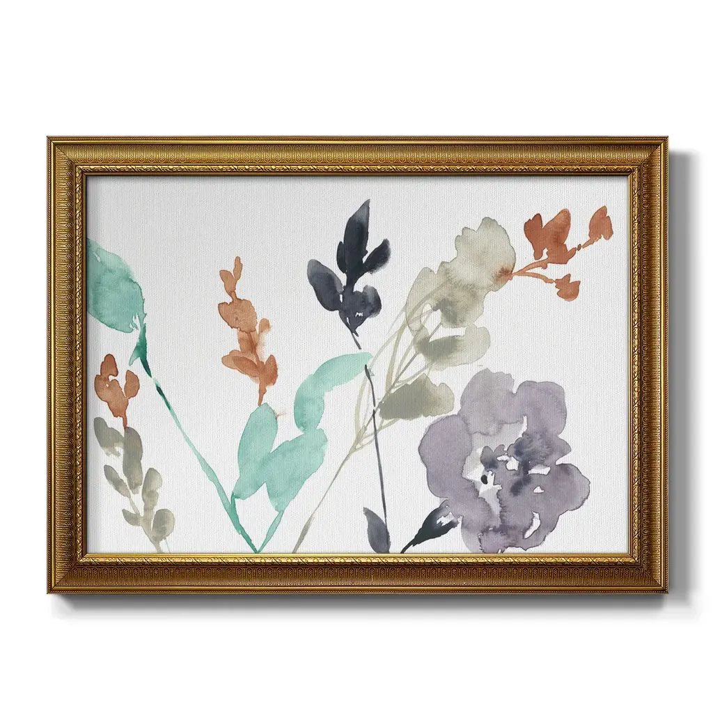 Flowers in Fall II Premium Framed Canvas- Ready to Hang A Premium Framed Canvas created to last. Framed in distressed wood and available in an array of sizes and colors Featuring a beveled a solid wood stretcher bar, each piece comes ready to hand 3 SIZES AVAILABLE 16''X20'' - Overall Size 18'X27'' - Overall Size 24''x36'' - Overall Size Each piece is made to order. Each piece comes with hanging hardware. Made in the USA Ready to Hang Giclee Paper Print Acrylic Glass Beveled Matt Board