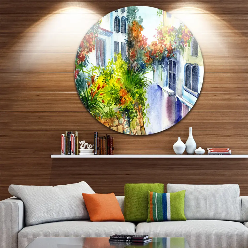 Flowers Near The House, Landscape Disc Metal Artwork, 36"