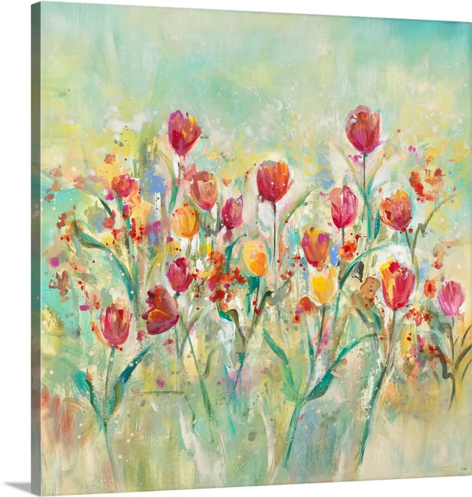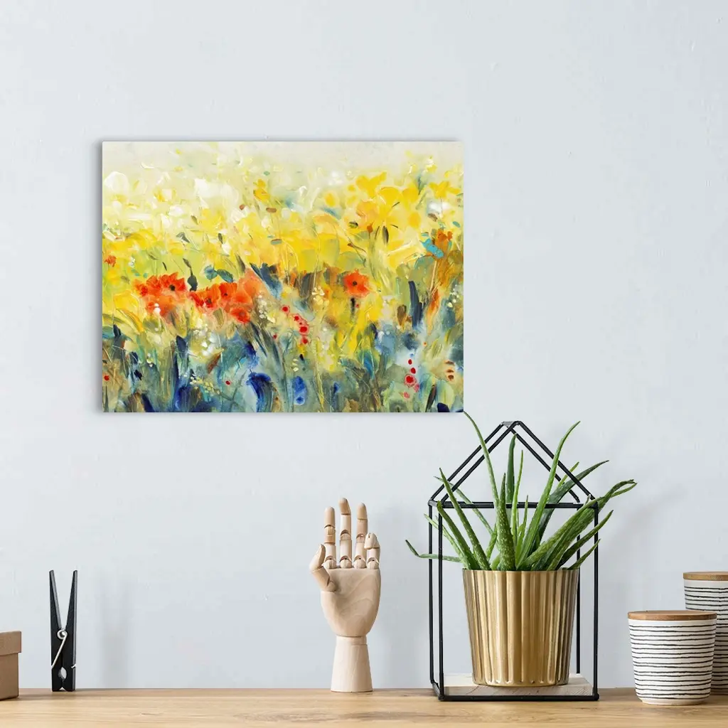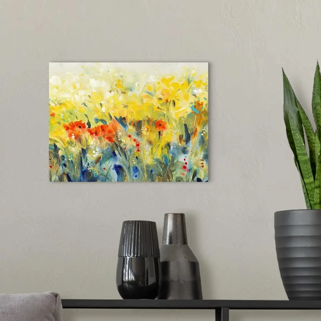 Contemporary painting of a field of a wildflowers in golden yellow and deep red.