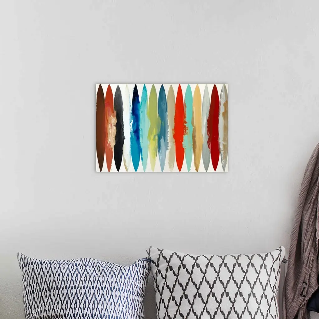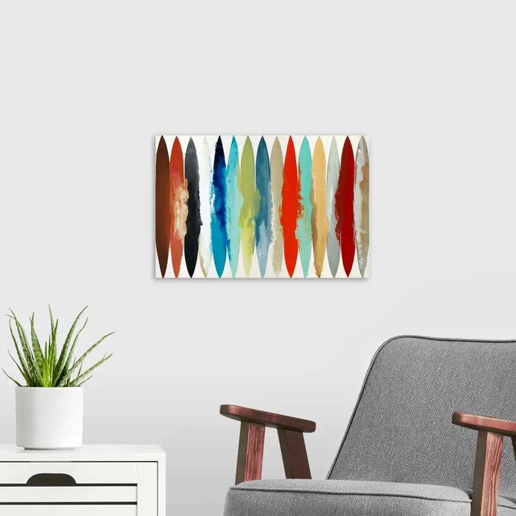 Large abstract painting with different colored oblong shapes lined up together going across the center with their colors bleeding in to each other.