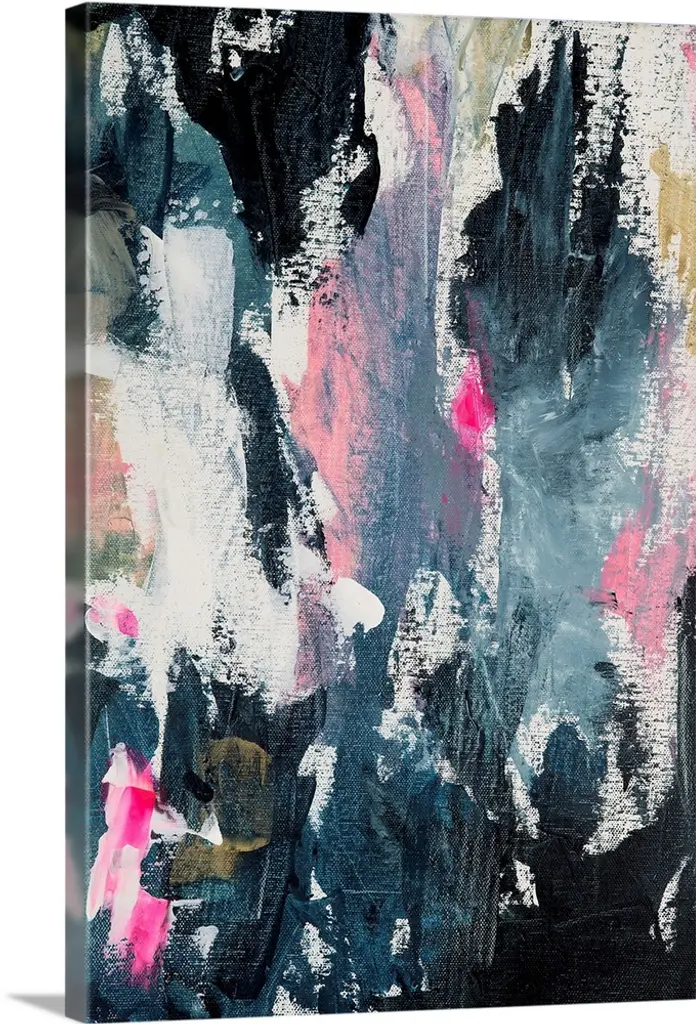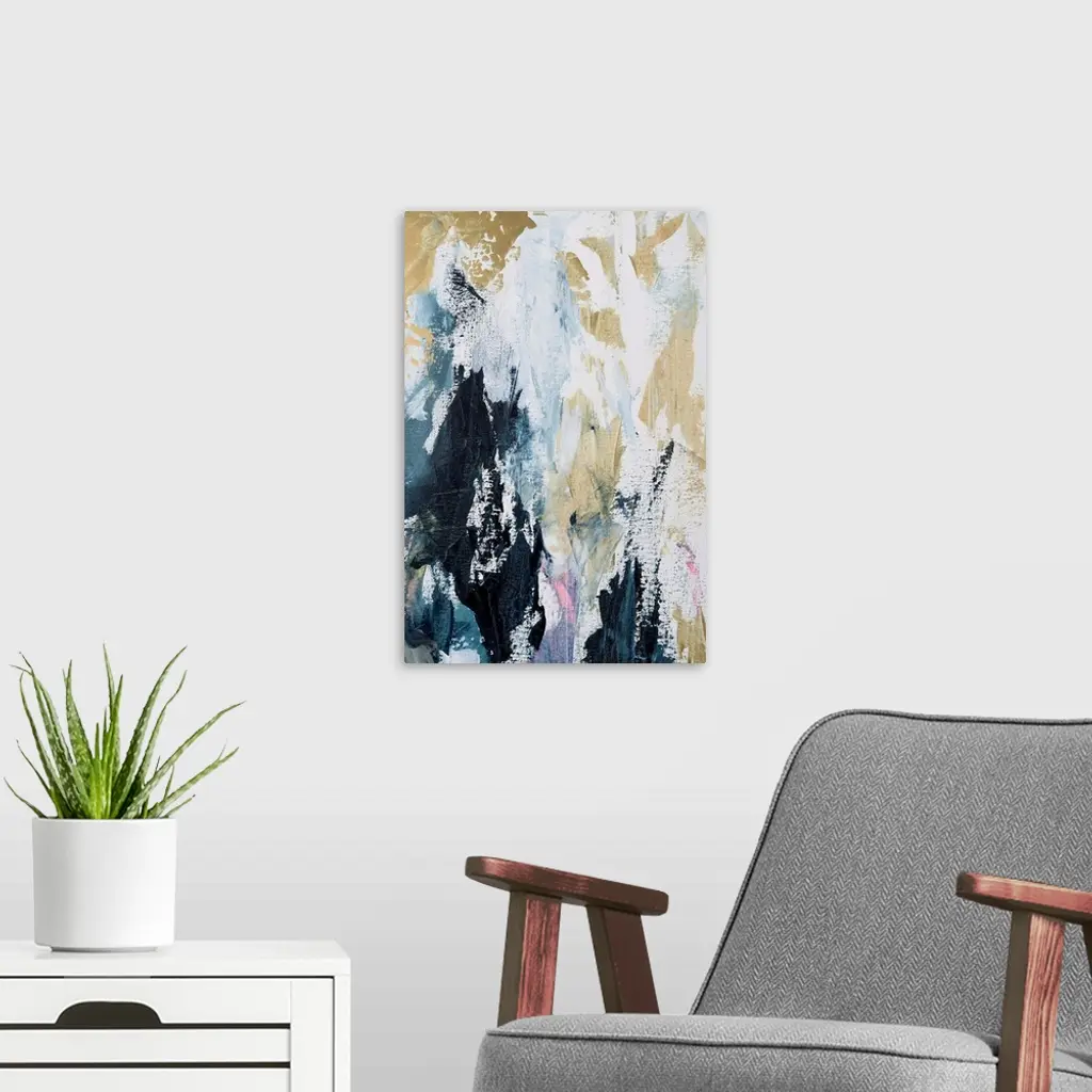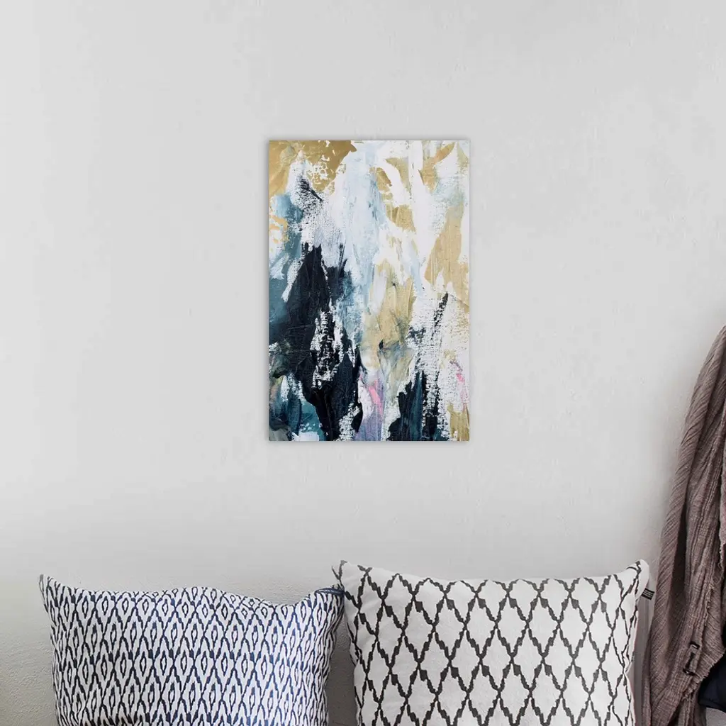 Complementary abstract painting in textured vertical strokes of blue, pink and gold.