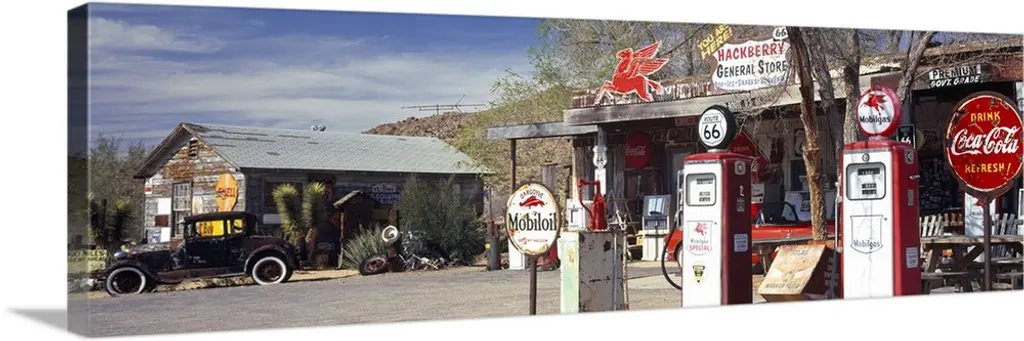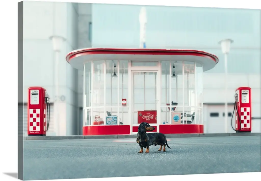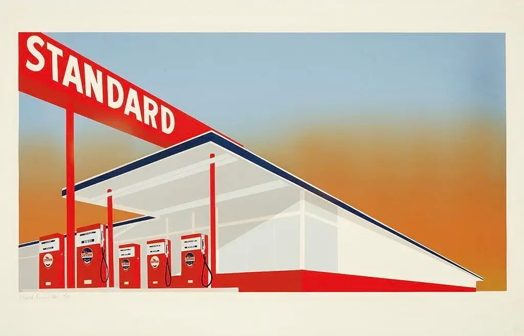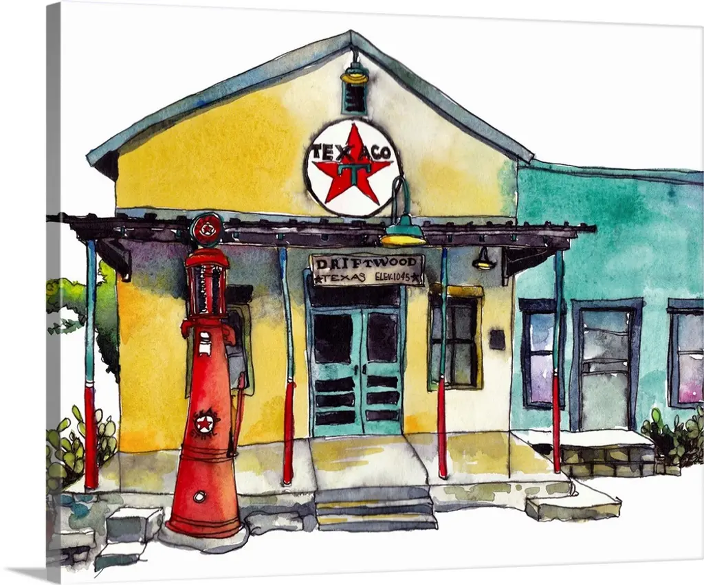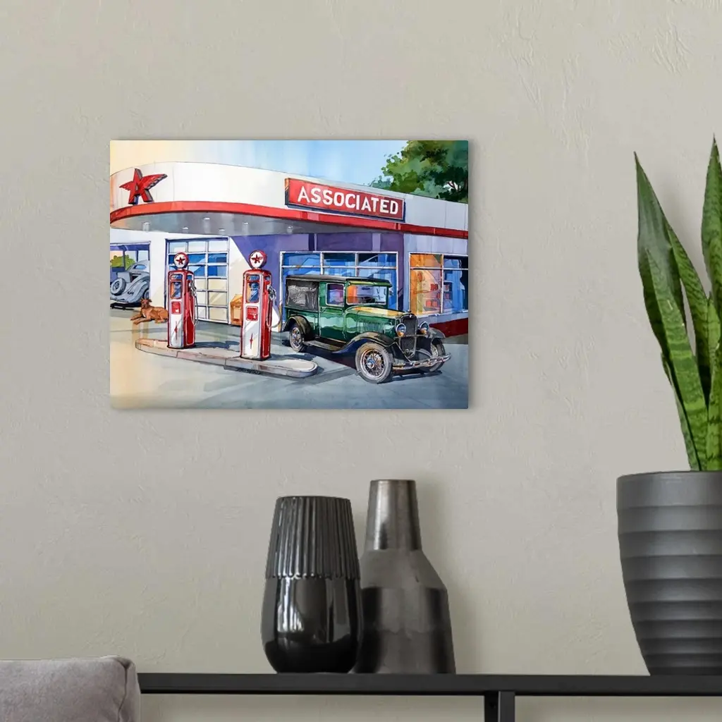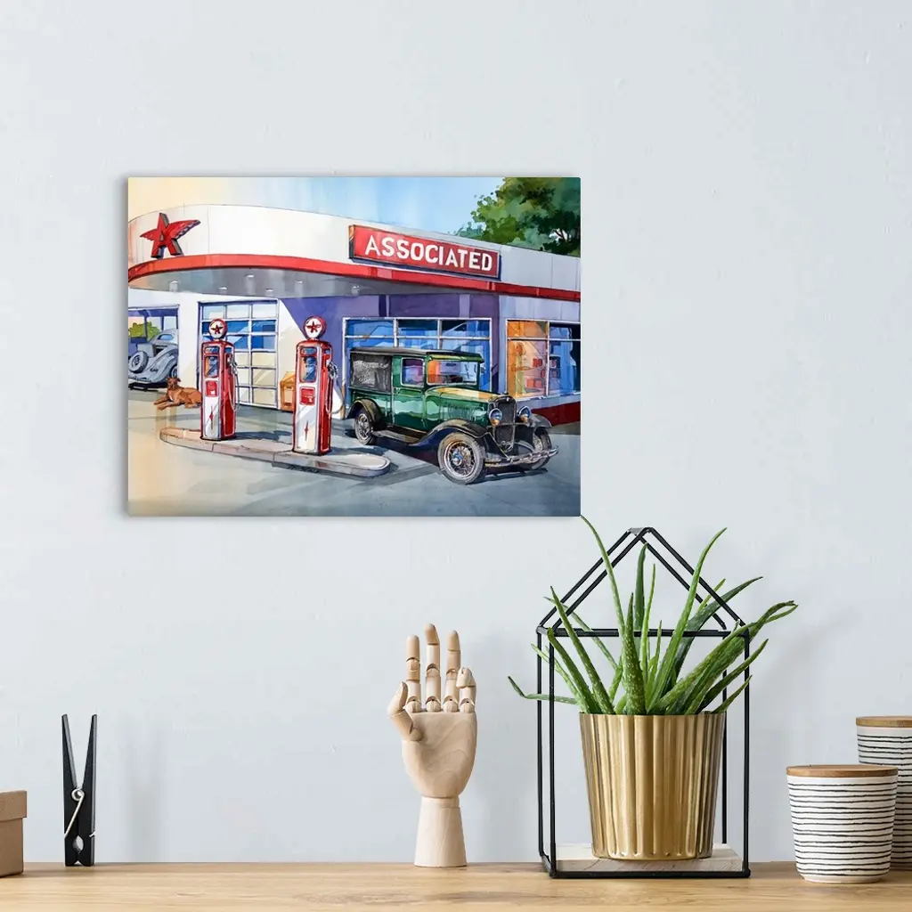 Watercolor painting of a Flying A gas station with a vintage car filling up.