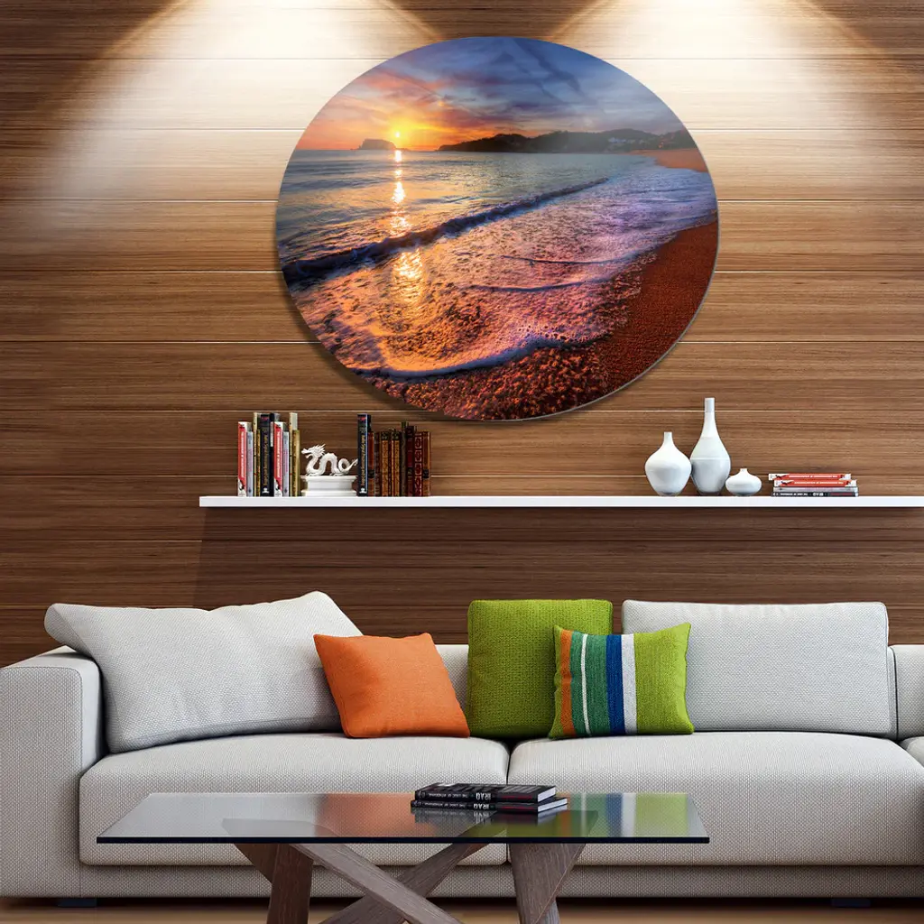 Bring Contemporary Abstraction to your home with this large Circle Metal wall art. This Foaming Waves at Beautiful Sunset Metal Artwork makes it the focal point of any room or office. - White Gloss Coating ensures colors are extra vibrant with light reflection.- Aluminum grade Sheet Metal with 1 inch mounting frame on the back giving the illusion that the artwork is floating on the wall..- Mounting Brackets are included along with instructions.- High Quality Digital images are created directly into a glossy aluminum panel producing a stunning and captivating print into the glossy finish of the metal.- Water, Fire and Scratch resistant HD Aluminum panels.- Looks better than any photo paper and guaranteed to last at least 20 years- Easy to clean with a microfiber cloth. Colors are far superior to regular Canvas Art. - Easy to Hang